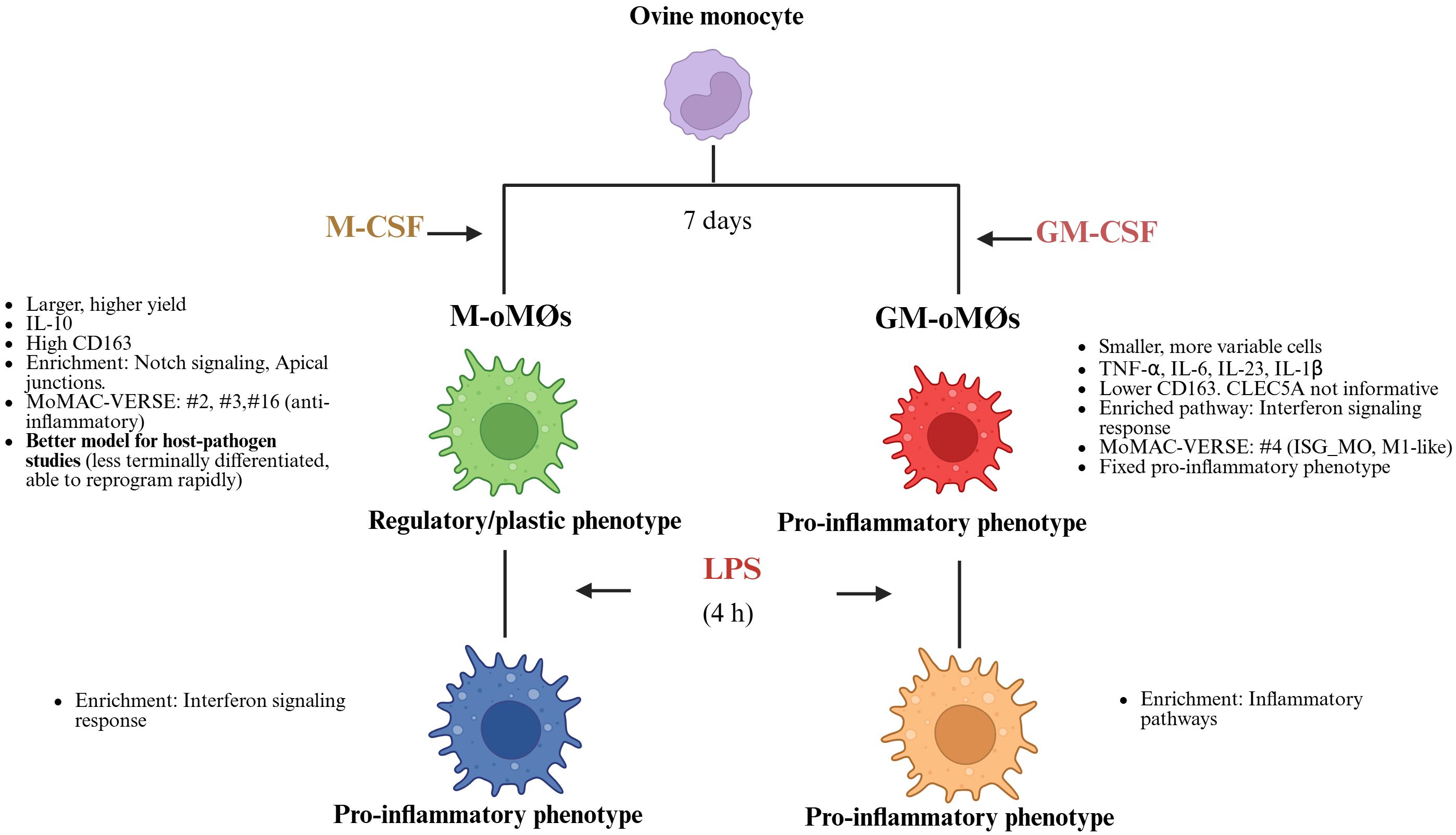 Flowchart of ovine monocyte differentiation over 7 days. M-CSF leads to M-oMØs with a regulatory phenotype, larger cells, high IL-10 and CD163, and Notch signaling. GM-CSF leads to GM-oMØs with a pro-inflammatory phenotype, smaller cells, TNF-α, IL-6, and lower CD163. Both pathways can become pro-inflammatory with LPS exposure.