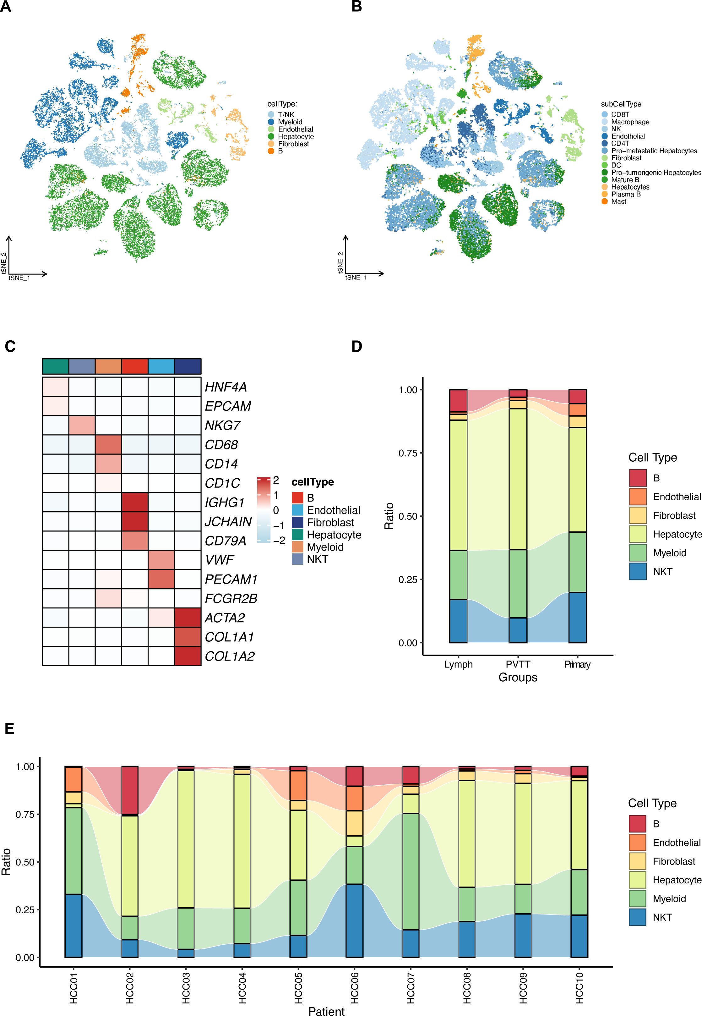Figure 1. Comprehensive single-cell RNA sequencing analysis of hepatocellular carcinoma (HCC). (A) T-SNE visualization of the transcriptional landscape identifying six major types within primary and metastatic HCC. (B) Further resolution of the T-SNE plot showing 13 sub cell types across the sampled HCC conditions. (C) Detailed expression profiles of specific cellular markers across the six identified major cell types, highlighting their distinct molecular signatures. (D) Relative proportions of the cell type distributions in primary HCC tumors (Primary), portal vein tumor thrombus (PVTT), and metastatic lymph node samples (Lymph). (E) Relative proportions of the identified cell types across different HCC patients, illustrating inter-individual variability.