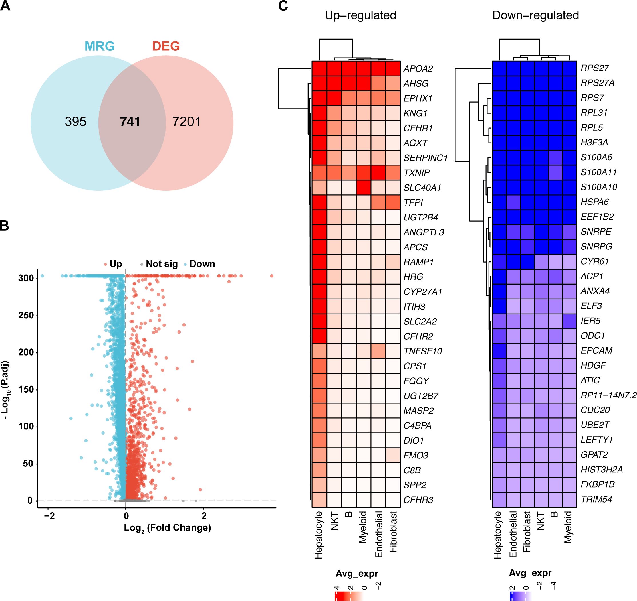 Figure 2. Differential expression of mitochondrial genes in HCC. (A) Discovery of 741 mitochondrial-related genes (MitRGs) that intersect with differentially expressed genes (DEG) in HCC, derived from an analysis incorporating MitoCarta3.0 data. (B) Volcano plot depicting significant upregulated and downregulated genes in metastatic versus primary HCC samples, emphasizing gene expression variations. (C) Heatmap presentation of the most significantly altered genes in metastatic HCC, comparing these changes to primary tumor profiles.