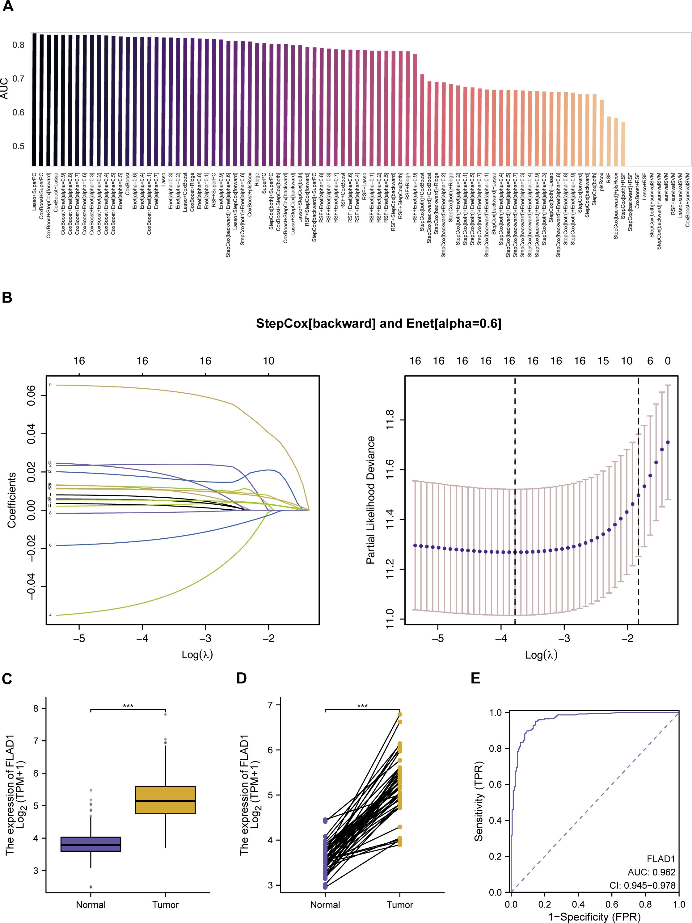Figure 3. Development and evaluation of machine learning models for predicting mitochondrial gene expression in HCC. (A) AUC scores for 92 machine learning algorithm combinations, tested within TCGA cohorts, demonstrating model performance. (B) StepCox[backward] and Enet analysis. (C) The mRNA levels of FLAD1 in normal and HCC tissues, comparing data from TCGA and GTEx databases to showcase expression alterations. (D) Comparative analysis of FLAD1 expression in HCC tumors versus adjacent non-tumor liver tissues from TCGA, highlighting the genes with significant differential expression. (E) Receiver operating characteristic (ROC) curve demonstrates the diagnostic potential of the hub MitRG FLAD1 in HCC, with an AUC of 0.962, underscoring its high accuracy. ***P < 0.001.