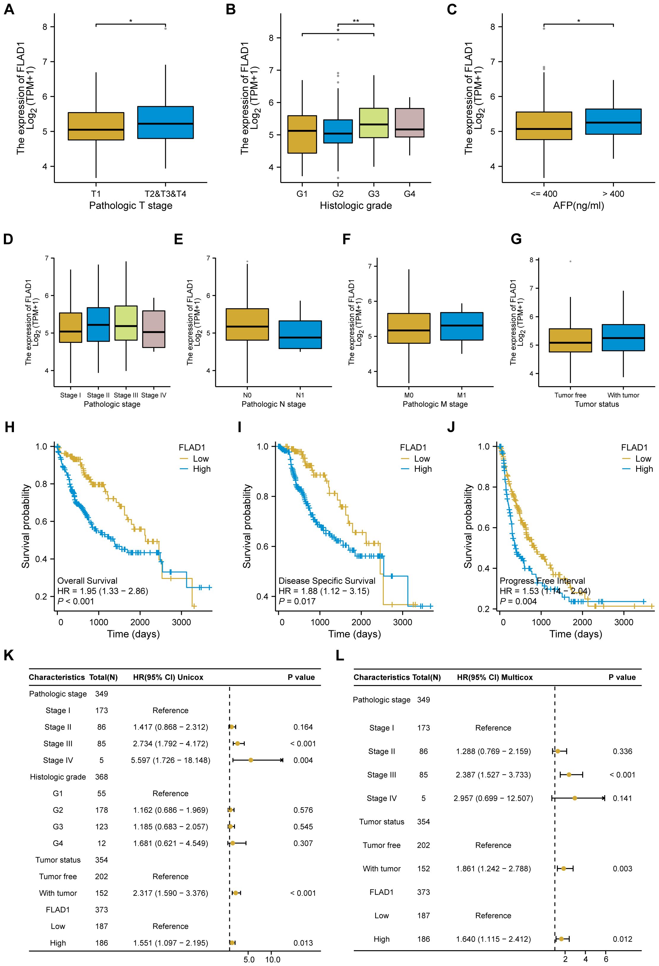 Figure 4. Associations between FLAD1 expression and clinicopathological features in patients with HCC, and Influence of FLAD1 levels on HCC prognosis assessed by Kaplan-Meier analysis. Correlations with (A) pathological T stage, (B) histological grade, (C) AFP level, (D) pathological stage, (E) N stage, (F) M stage, and (G) tumor status are presented, with significance denoted as *P < 0.05, **P < 0.01. (H) Overall survival (OS), (I) disease-specific survival (DSS), and (J) progression-free interval (PFI) between the high and low FLAD1 expression groups. Forest plot illustrating the impact of FLAD1 on OS based on (K) univariate and (L) multivariate Cox regression analyses.