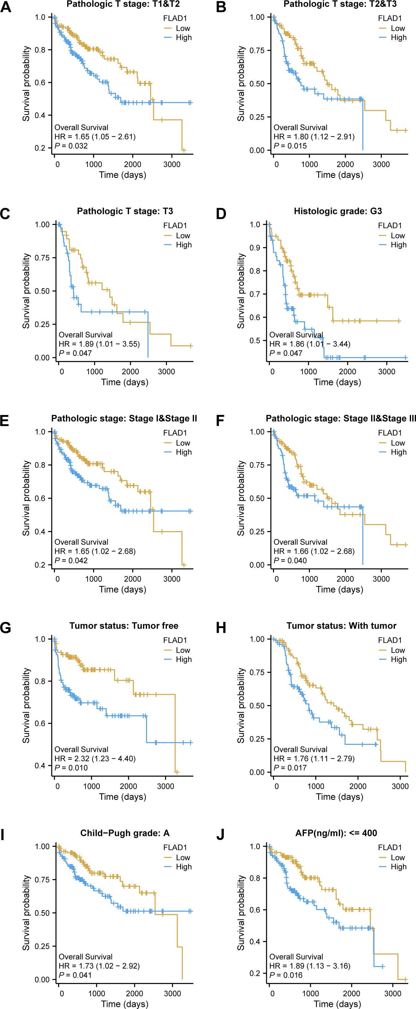 Figure 5. Kaplan-Meier analysis of the prognostic impact of FLAD1 levels across various subgroups of patients with HCC. Survival curves for (A–J), including T1 vs. T2, T2 vs. T3, T3 alone, G3, Stage I vs. II, Stage II vs. III, tumor-free vs. with tumor, Child-Pugh grade A, and AFP levels below 400, comparing high and low FLAD1 expression groups.