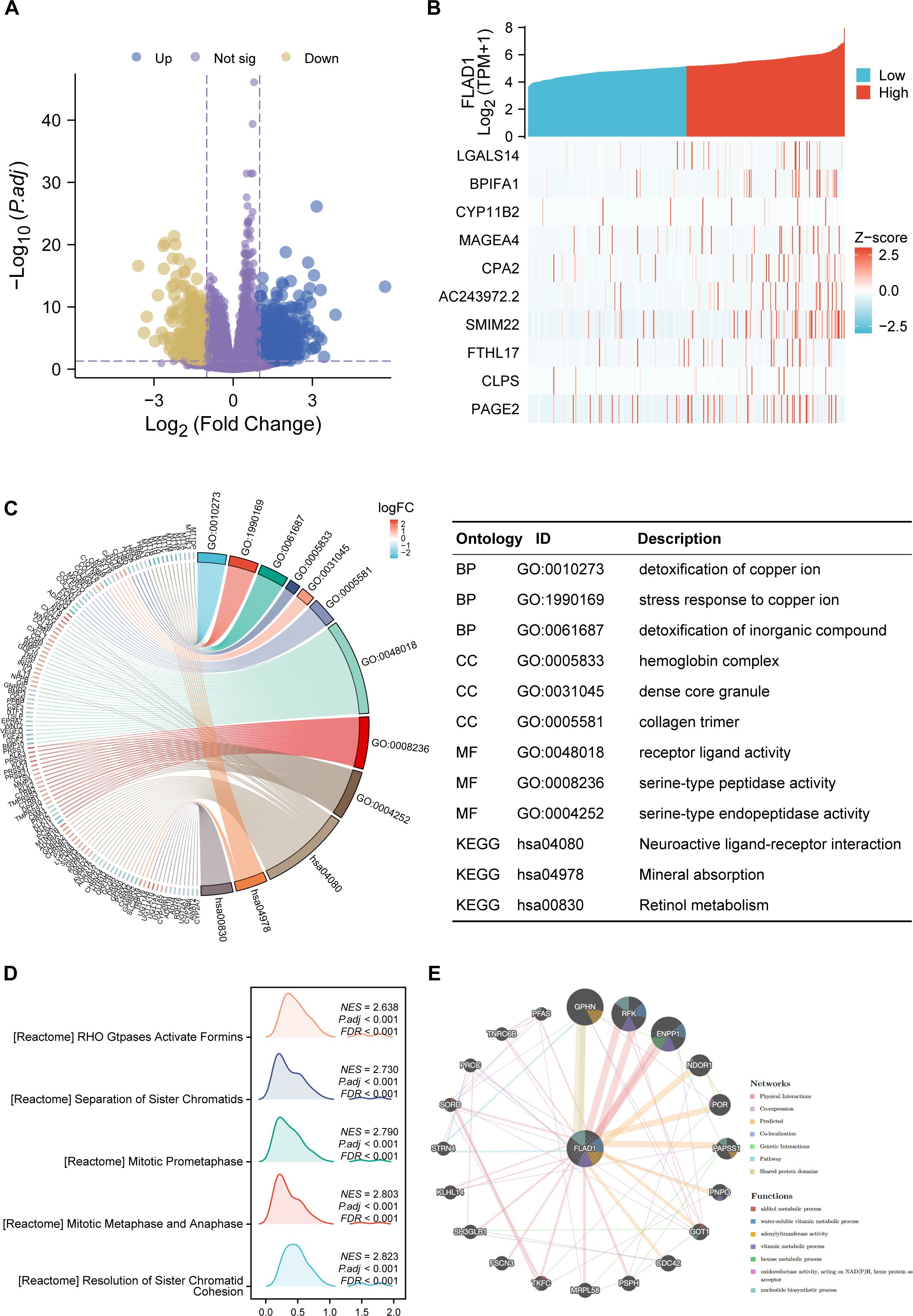 Figure 6. DEGs related to FLAD1 and their functional enrichment analysis. (A) Volcano plot showing upregulated (blue dots) and downregulated (yellow dots) DEGs between HCC tissues and paired cancer-adjacent tissues from TCGA data. (B) The top ten DEGs positively correlated with FLAD1. (C) GO and KEGG analyses of DEGs. (D) GSEA of DEGs. (E) GeneMANIA analysis showing the interaction network of FLAD1 and related genes.