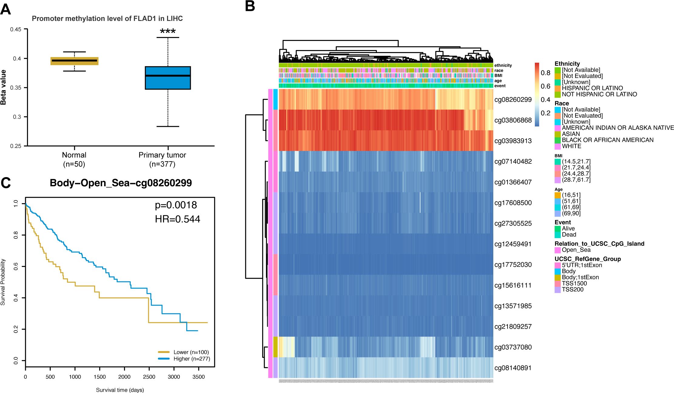 Figure 7. FLAD1 promoter methylation and its prognostic impact on HCC. (A) Lower methylation levels at the FLAD1 promoter in HCC tissues than in normal liver tissues. (B) Correlation between FLAD1 mRNA expression and methylation status. (C) Kaplan-Meier survival curves for patients with different FLAD1 methylation levels. P-values were determined using a two-tailed unpaired Student’s t test, with significance denoted as ***P < 0.001.