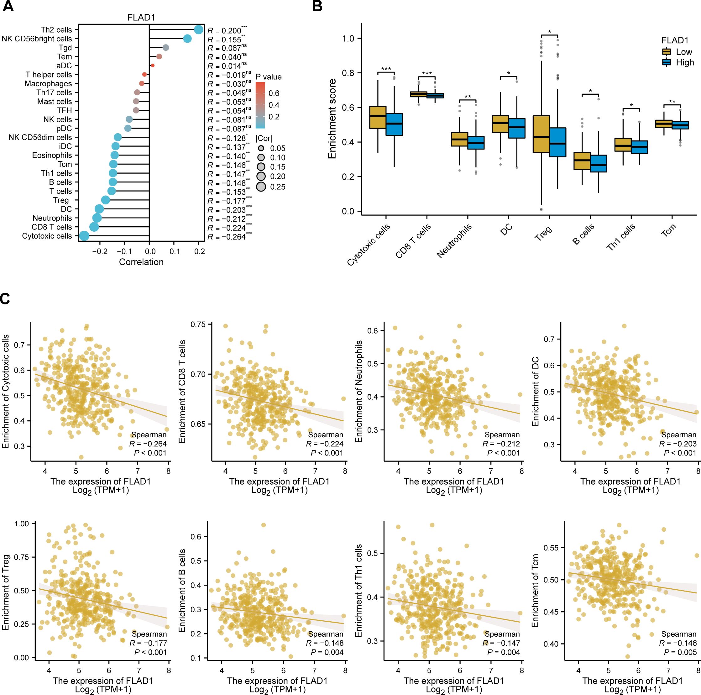 Figure 8. Relationship between FLAD1 expression and immune cell infiltration in HCC. (A) Correlations between FLAD1 expression and 24 types of immune cells. (B) Comparison of immune cell infiltration levels between the high- and low-FLAD1 expression groups. (C) Negative correlation between FLAD1 expression and the level of immune cell infiltration. P-values were calculated with two-tailed unpaired Student’s t tests, with significance denoted as *P < 0.05, **P < 0.01, and ***P < 0.001.