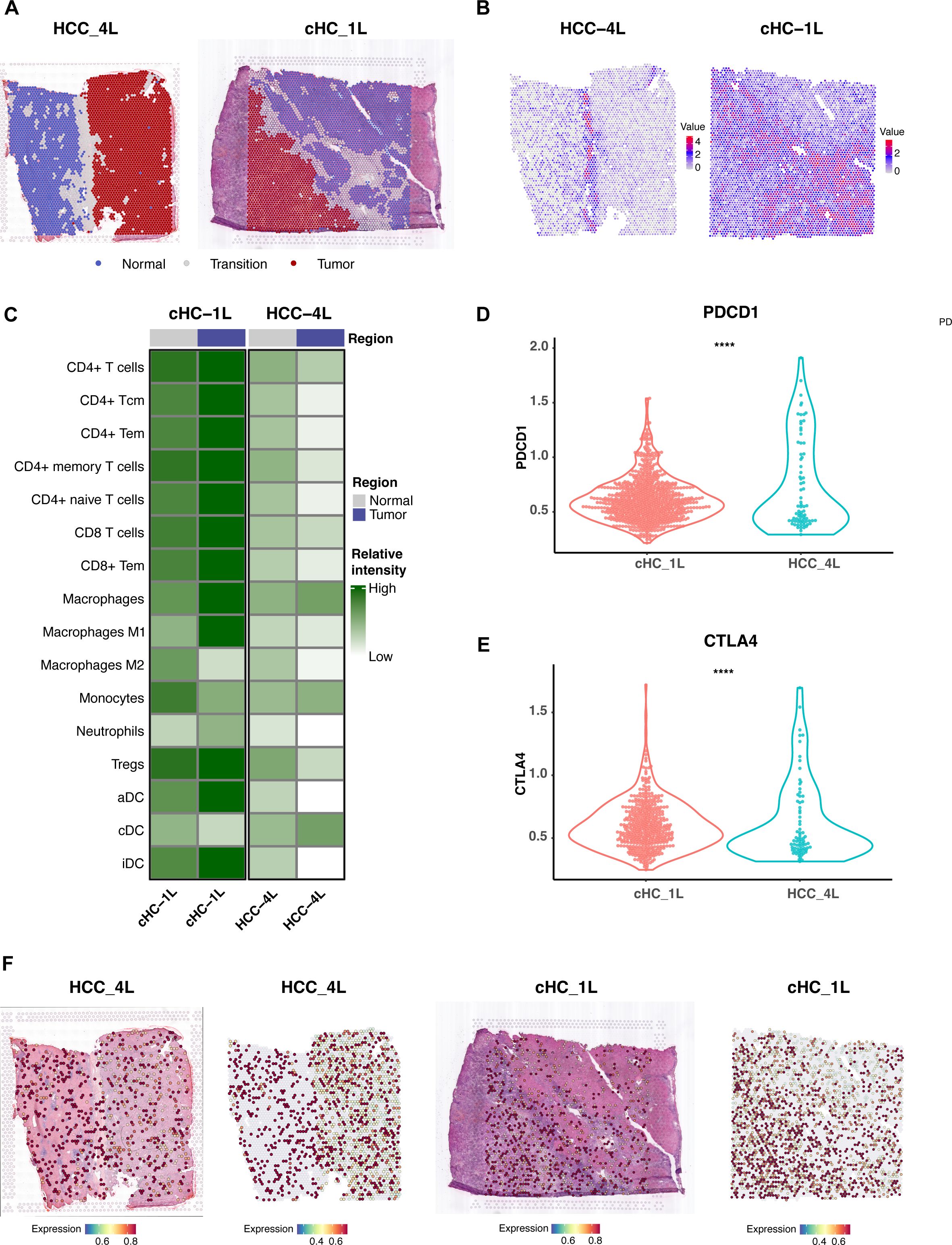 To understand how the physical structure of HCC influences the tumor microenvironment (TME) and to spatially validate our findings, we analyzed spatial transcriptomics data from two distinct HCC samples: one with a complete capsule (CC group, HCC-4L) and another without a complete capsule (NC group, cHC-1L) (Figure 9A).