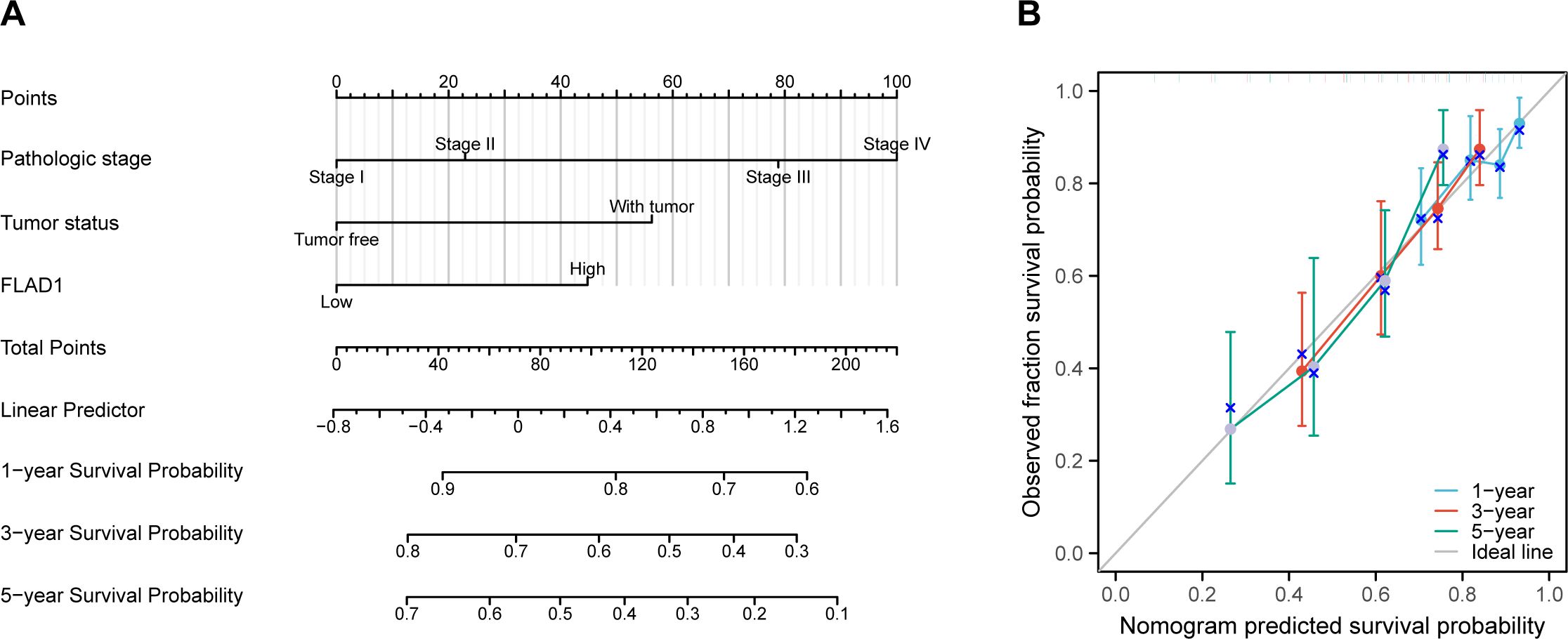 A nomogram was created to forecast the prognosis of HCC patients by integrating various independent prognostic factors. The nomogram indicated that a higher total point score, representing a greater presence of adverse factors, corresponded with a worsened prognosis (Figure 10A). Calibration curves were used to evaluate the precision and dependability of the nomogram’s predictive efficacy (Figure 10B). These results confirmed that FLAD1 plays a critical role as an independent prognostic factor for HCC.