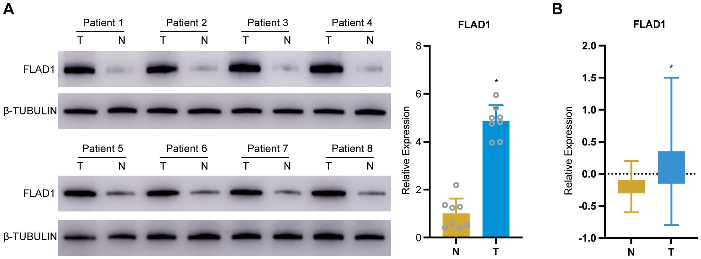 Sample collection in the study received ethical approval (Approval No.: 2025-333-05PJ and 2021-15). Key clinical characteristics of this cohort are summarized in Supplementary Table S1. Proteins were extracted using RIPA buffer (Beyotime, USA) enhanced with 1% PMSF. Subsequent separation of proteins was conducted via SDS-PAGE and the proteins were then transferred to PVDF membranes. These membranes were blocked with 5% nonfat milk and incubated overnight at 4 °C with primary antibodies against β-TUBULIN (#66240-1-Ig, Proteintech, Wuhan, China) and FLAD1 (#68491-1-Ig, Proteintech, Wuhan, China). Following primary antibody incubation, the membranes were exposed to the appropriate secondary antibodies. Detection of proteins was achieved through enhanced chemiluminescence. Semi-quantitative analysis of the proteins was performed using ImageJ software (v2.14.0) (39), allowing for measurement of protein levels.