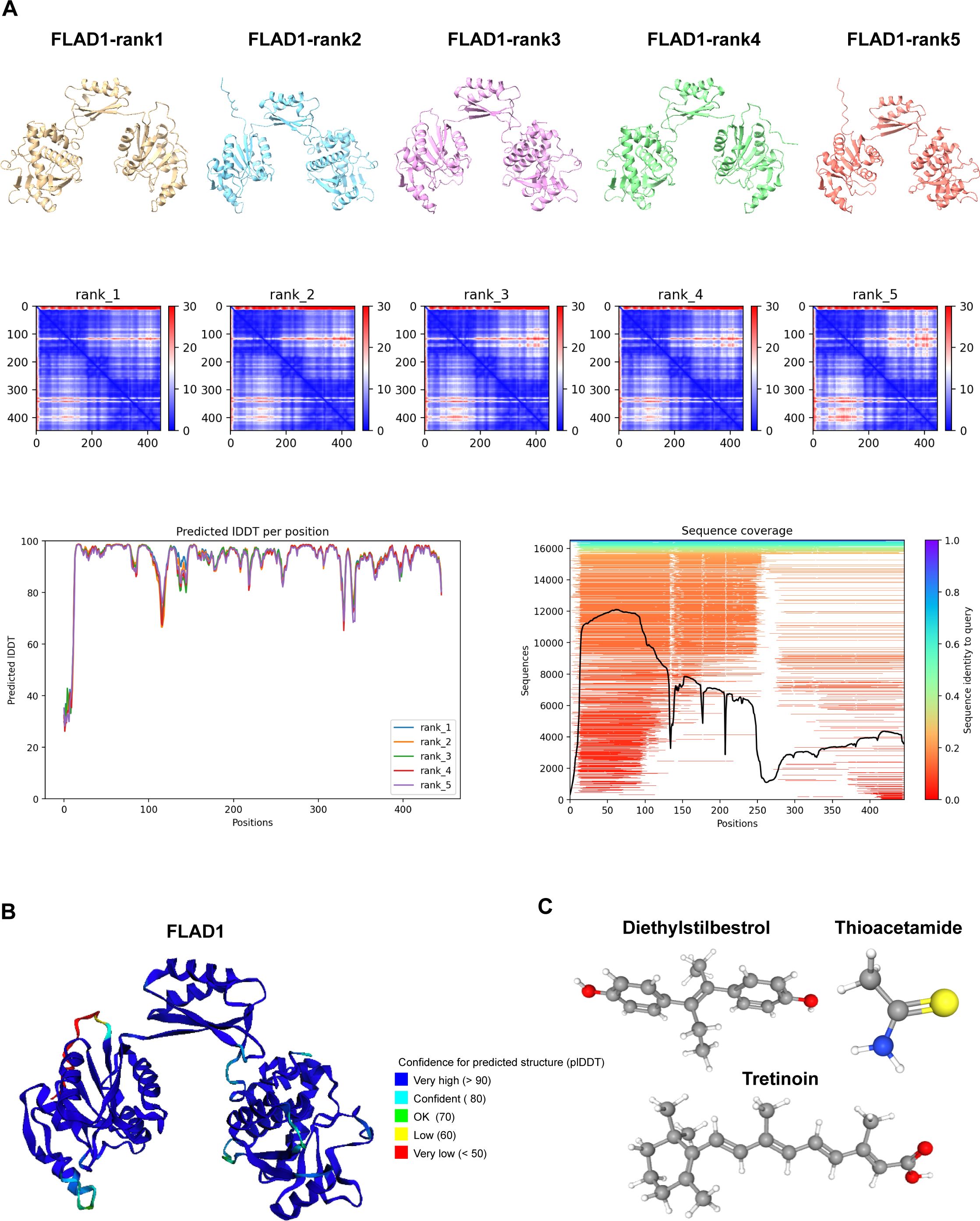 Figure 12. Predictive Modeling of FLAD1 Protein Structures Using AlphaFold 2. (A) AlphaFold 2 was utilized to predict the structures of FLAD1 under default conditions, with the models ranked by confidence. The predicted structures are displayed in various colors (yellow, blue, purple, green, orange), each corresponding to their Predicted Aligned Error (PAE), predicted Local Distance Difference Test (plDDT) values, and sequence coverage, illustrating the accuracy and reliability of the predictions. (B) The highest-ranked AlphaFold 2 model of FLAD1 (rank1) is depicted, showcasing the predicted folding and conformational dynamics of the protein within a cellular context. This model highlights the structural intricacies and potential functional domains of FLAD1. (C) Three-dimensional molecular structures of Diethylstilbestrol, Thioacetamide, and Tretinoin are illustrated, emphasizing their unique chemical configurations.