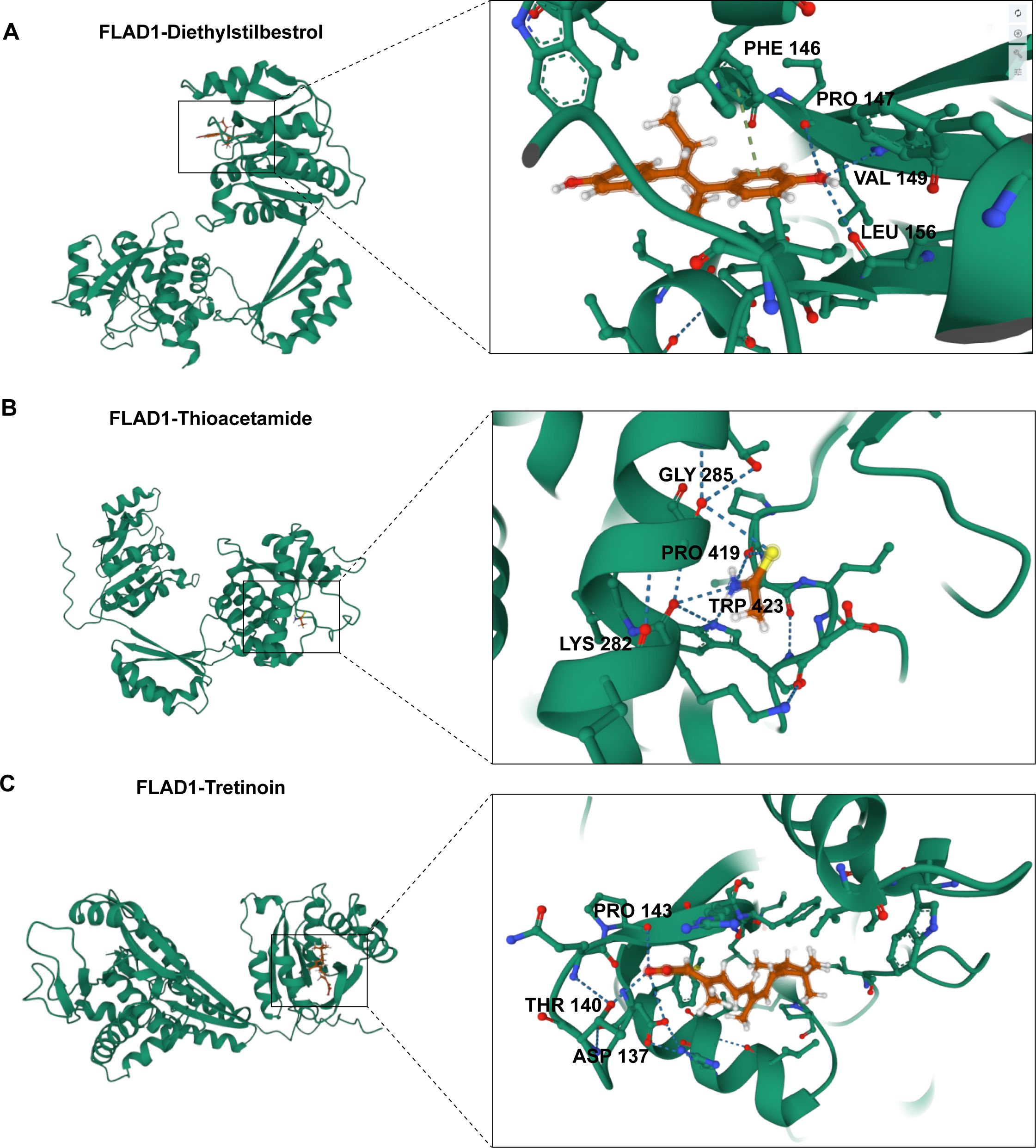 Figure 13. Predictive modeling of the interactions of FLAD1 with various ligands using molecular docking techniques. (A) Interaction analysis of Diethylstilbestrol with the FLAD1 protein through molecular docking, highlighting the binding efficiency and potential sites of interaction. (B) Docking simulation of Thioacetamide with FLAD1, demonstrating the molecular engagement and potential impact on FLAD1 function. (C) Tretinoin’s docking with FLAD1 depicted to reveal the binding patterns and interaction dynamics, which may influence the biological activity of FLAD1.