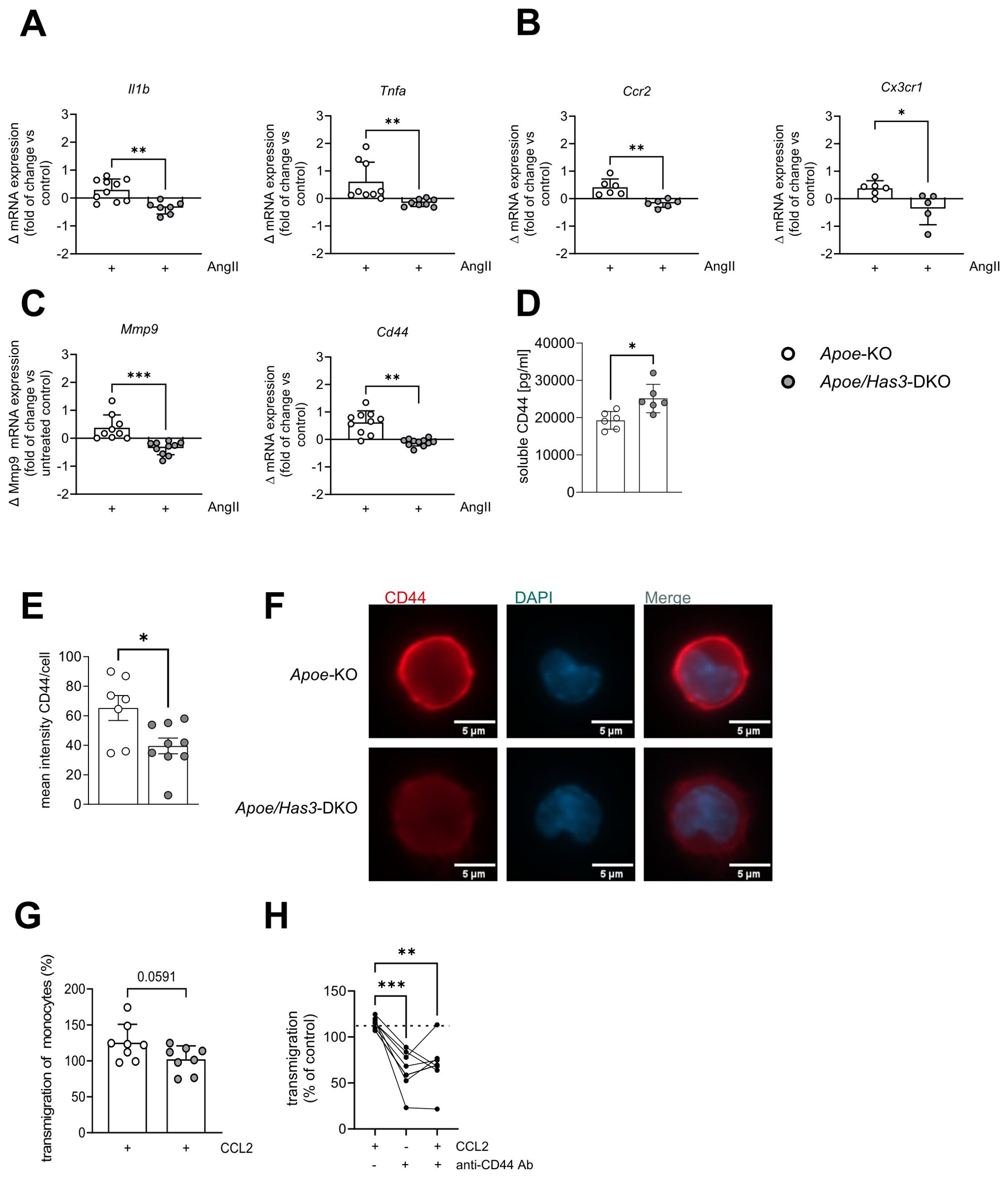 Results: Has3 deficiency improved survival in Apoe/Has3-DKO mice via reducing aortic ruptures. This was associated with decreased monocyte infiltration into the vessel wall. Aortic RNA-Seq analysis indicated disturbed immune cell adhesion and diapedesis. Transfer of Apoe-deficient bone marrow into Apoe/Has3-DKO mice largely normalized the Apoe/Has3-DKO phenotype. While gene expression in endothelial cells (ECs) was not affected, AngII-induced upregulation of proinflammatory cytokines, adhesion receptors and the HA receptor CD44 was attenuated in Apoe/Has3-DKO monocytes. This reduced CD44 cell surface expression in Apoe/Has3-double-deficient monocytes, ultimately inhibiting their in vitro transmigration.