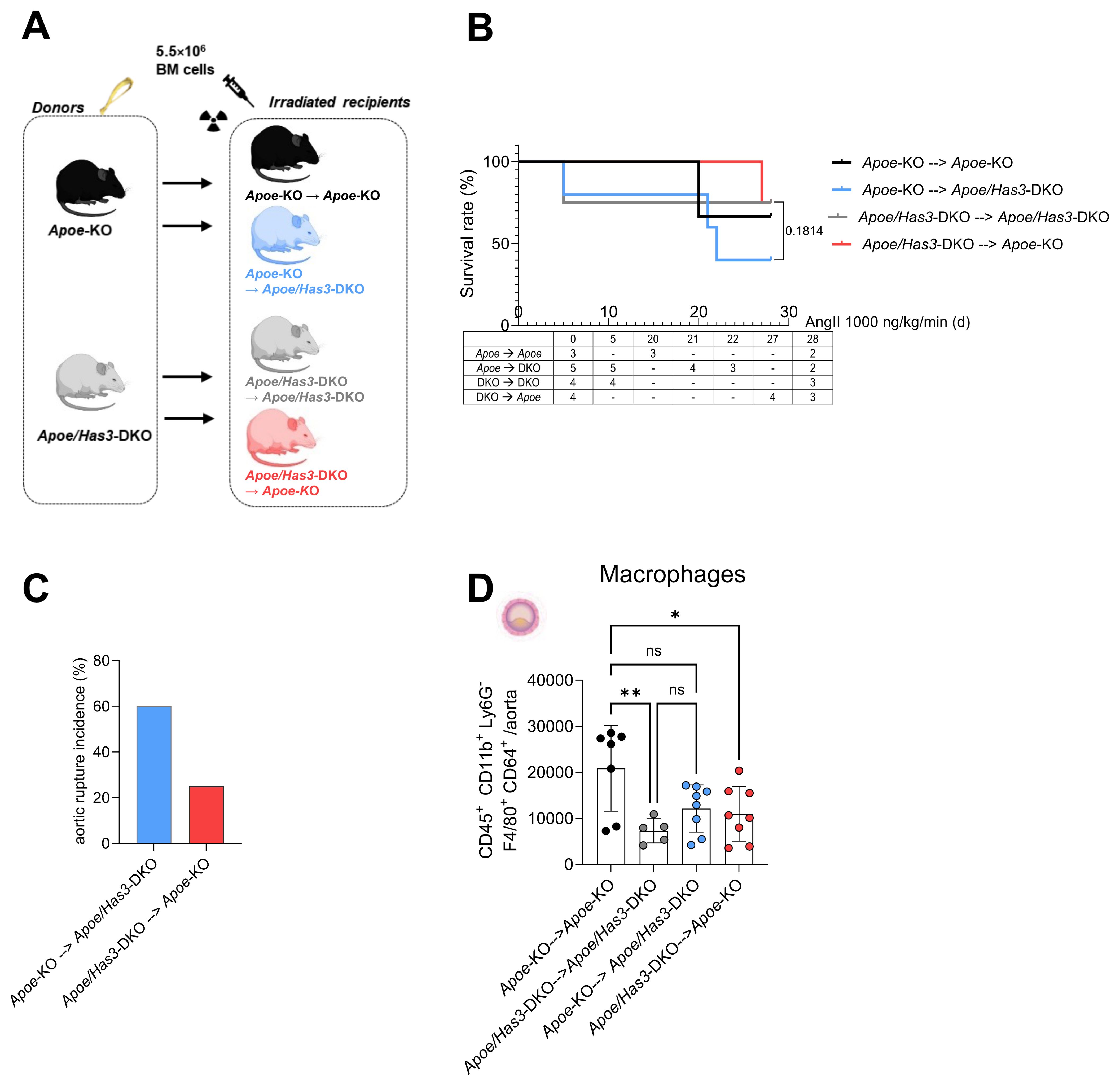Statistics were performed using the GraphPad Prism 10 Software (La Jolla, CA, USA). If not differently specified, the results are given as mean ± standard deviation (SD). All data sets were tested for outliers using Grubb’s test (α=0.05). To compare the incidence of AD and aneurysm, Fisher’s exact test was performed. The Log-Rank Mantel-Cox test was used to compare survival curves. To compare survival rates between Apoe-KO → Apoe/Has3-DKO and Apoe/Has3-DKO into Apoe-KO after BMT experiments, the Gehan-Breslow-Wilcoxon test was used. For continuous variables, normality and homogeneity of variance were assessed by Shapiro-Wilk and Brown-Forsythe tests, respectively. Unpaired t-test or Mann-Whitney U-test was used to detect significant differences among 2 groups for normally distributed data or non-normally distributed data, respectively. Multi-group-analyses were made by Kruskal Wallis test followed by Dunn’s test or by One-way ANOVA followed by Tukey’s or Sidak’s multiple comparison test between groups showing normal distribution. For repeated time point measurements, data were analyzed by 2-way ANOVA followed by Tukey’s or Sidak’s post hoc tests as appropriate. P < 0.05 was considered statistically significant.