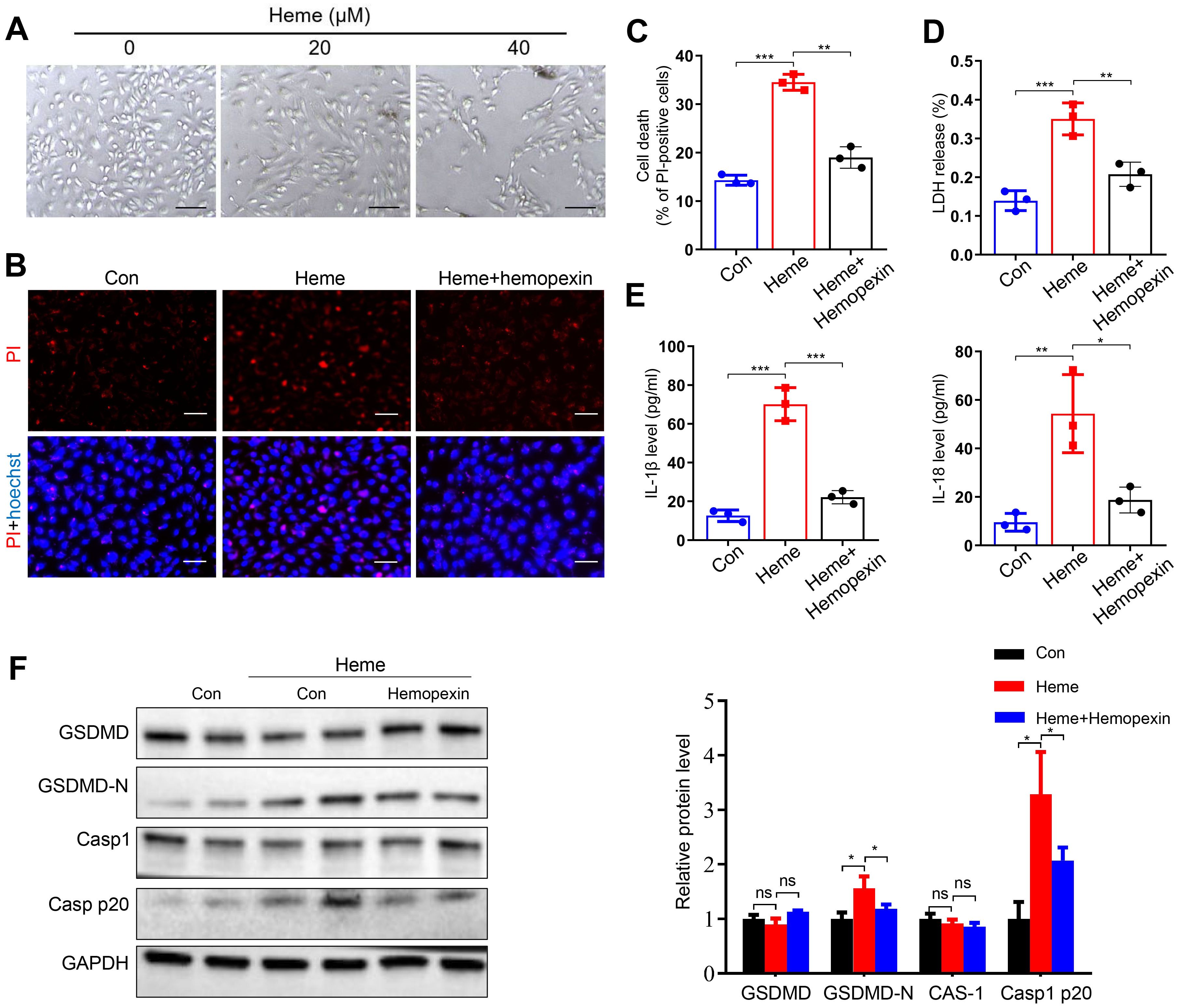 Figure 1. Hemopexin inhibits heme-induced pyroptosis of HUVECs. (A) The morphological changes of HUVECs were observed at 24 h after heme treatment. Scale bar = 100 µm. (B) The HUVECs were stained with PI and Hoechst for 20 min to observe cell death. Scale bar = 100 µm. (C) Cell death of HUVECs with treatment of heme and hemopexin was assayed (n=3, by one-way ANOVA). (D) The LDH level in supernatant of HUVECs with treatment of heme and hemopexin was detected (n=3, by one-way ANOVA). (E) Levels of IL-1β and IL-18 in supernatant of HUVECs with treatment of heme and hemopexin were assayed by ELISA (n=3, by one-way ANOVA). (F) Protein levels of GSDMD, GSDMD-N, Casp1, and Casp1 p20 in HUVECs with treatment of heme and hemopexin were detected by Western blot assay (n=3, by one-way ANOVA). The data are expressed as mean ± SEM. ns: no significance, *P < 0.05, **P < 0.01, ***P < 0.001.