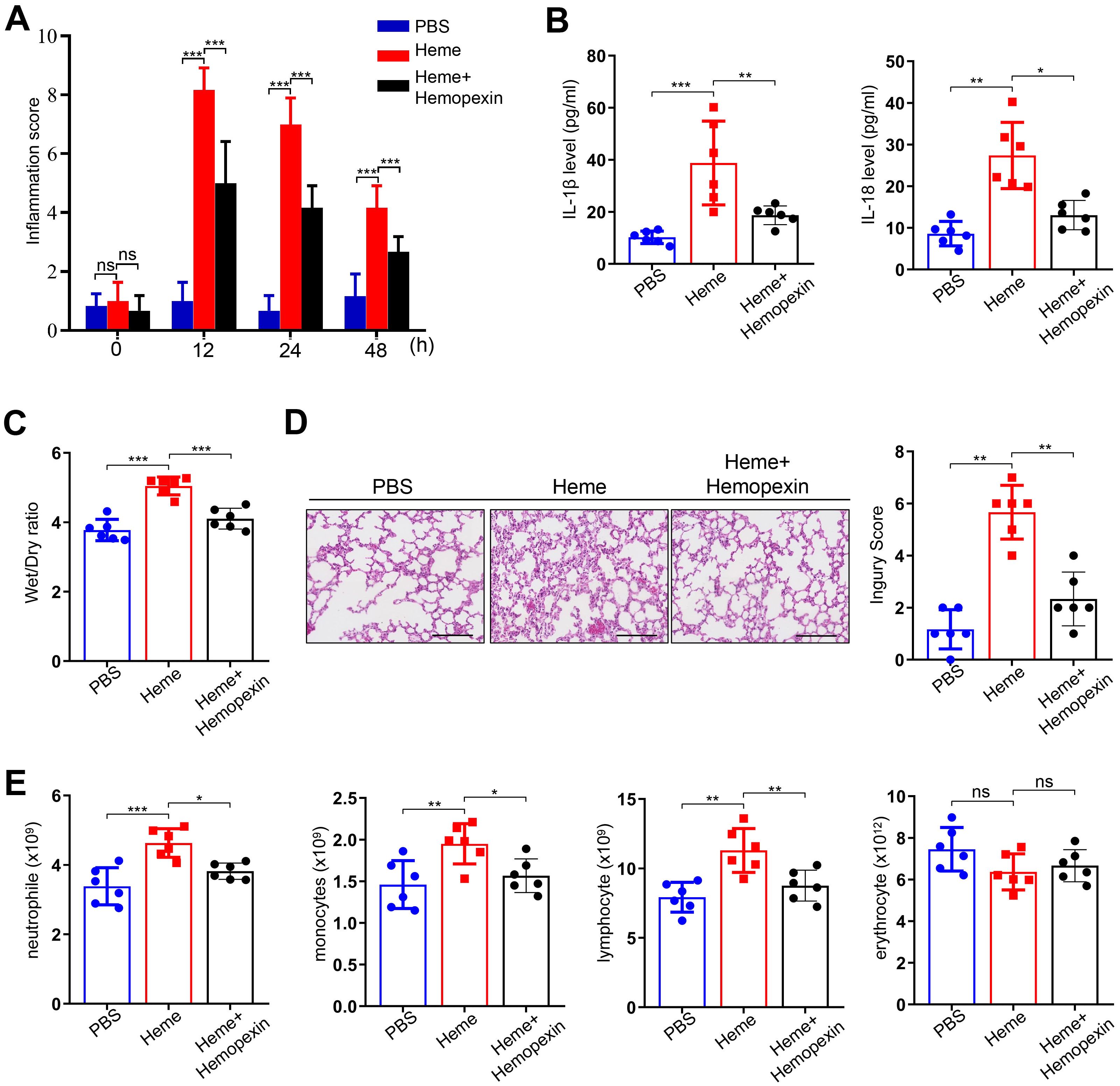 Figure 2. Hemopexin alleviates heme-induced SIRS in mice. (A) The inflammation score of mice was assayed at 0 h, 12 h, 24 h, and 48 h after treatment of heme and hemopexin (n=6, by one-way ANOVA). (B) The serum levels of IL-1β and IL-18 were detected after treatment of heme and hemopexin (n=6, by one-way ANOVA). (C) The wet-to-dry lung ratio was calculated after treatment of heme and hemopexin (n=6, by one-way ANOVA). (D) The pathological changes of lung tissues of mice were observed by HE staining after treatment of heme and hemopexin. Scale bar = 50 µm (n=6, by one-way ANOVA). (E) The neutrophile, monocyte, lymphocyte, and erythrocyte counts were detected after treatment of heme and hemopexin (n=6, by one-way ANOVA). The data are expressed as mean ± SEM. ns: no significance, *P < 0.05, **P < 0.01, ***P < 0.001.