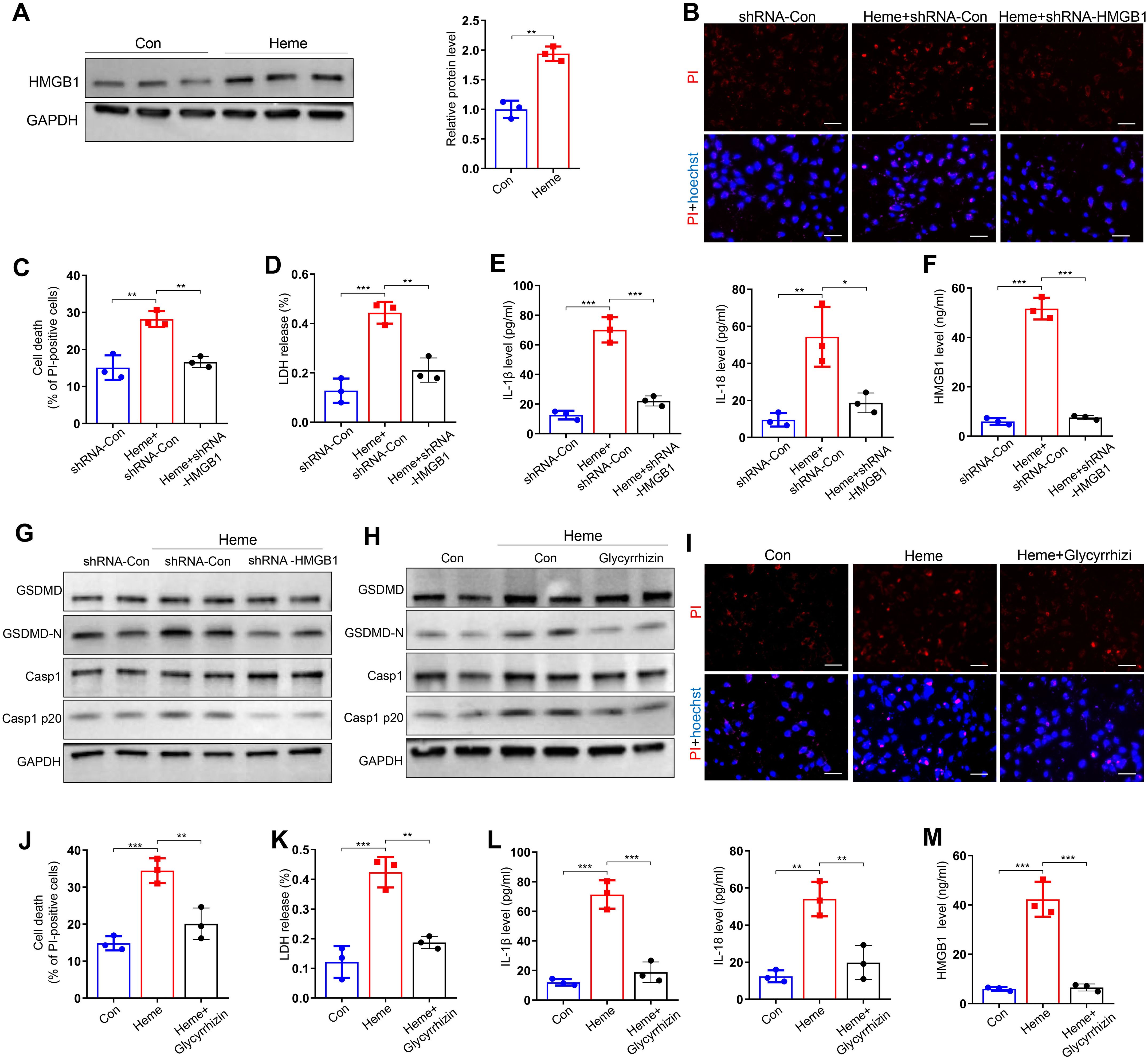 Figure 3. HMGB1 is involved in heme-induced pyroptosis of endothelial cells. (A) Protein level of HMGB1 in HUVECs was detected by Western blot assay after treatment of heme (n=3, by two-tailed Student’s t-test). (B) HMGB1 knockdown HUVECs were stained with PI and Hoechst for 20 min to observe cell death after heme treatment. Scale bar = 100 µm. (C) Cell death of HMGB1 knockdown HUVECs was assayed after heme treatment (n=3, by one-way ANOVA). (D) The level of LDH in supernatant of HMGB1 knockdown HUVECs was detected after heme treatment (n=3, by one-way ANOVA). (E) Levels of IL-1β and IL-18 in HMGB1 knockdown HUVECs supernatant were assayed by ELISA after heme treatment (n=3, by one-way ANOVA). (F) The level of HMGB1 in the supernatant of HMGB1 knockdown HUVECs was assayed by ELISA after heme treatment (n=3, by one-way ANOVA). (G) Protein levels of GSDMD, GSDMD-N, Casp1, and Casp1 p20 in HMGB1 knockdown HUVECs were detected by Western blot assay after heme treatment (n=3, by one-way ANOVA). (H) Protein levels of GSDMD, GSDMD-N, Casp1, and Casp1 p20 in HUVECs were detected by Western blot assay after treatment of heme and glycyrrhizin (n=3, by one-way ANOVA). (I) HUVECs were stained with PI and Hoechst for 20 min to observe cell death after treatment of heme and glycyrrhizin. Scale bar = 100 µm. (J) Cell death of HUVECs was assayed after treatment of heme and glycyrrhizin (n=3, by one-way ANOVA). (K) The level of LDH in supernatant of HUVECs was detected after treatment of heme and glycyrrhizin (n=3, by one-way ANOVA). (L) Levels of IL-1β and IL-18 in HUVECs supernatant were assayed by ELISA after treatment of heme and glycyrrhizin (n=3, by one-way ANOVA). (M) The level of HMGB1 in supernatant of HUVECs was assayed by ELISA after treatment of heme and glycyrrhizin (n=3, by one-way ANOVA).The data are expressed as mean ± SEM. ns: no significance, *P < 0.05, **P < 0.01, ***P < 0.001.