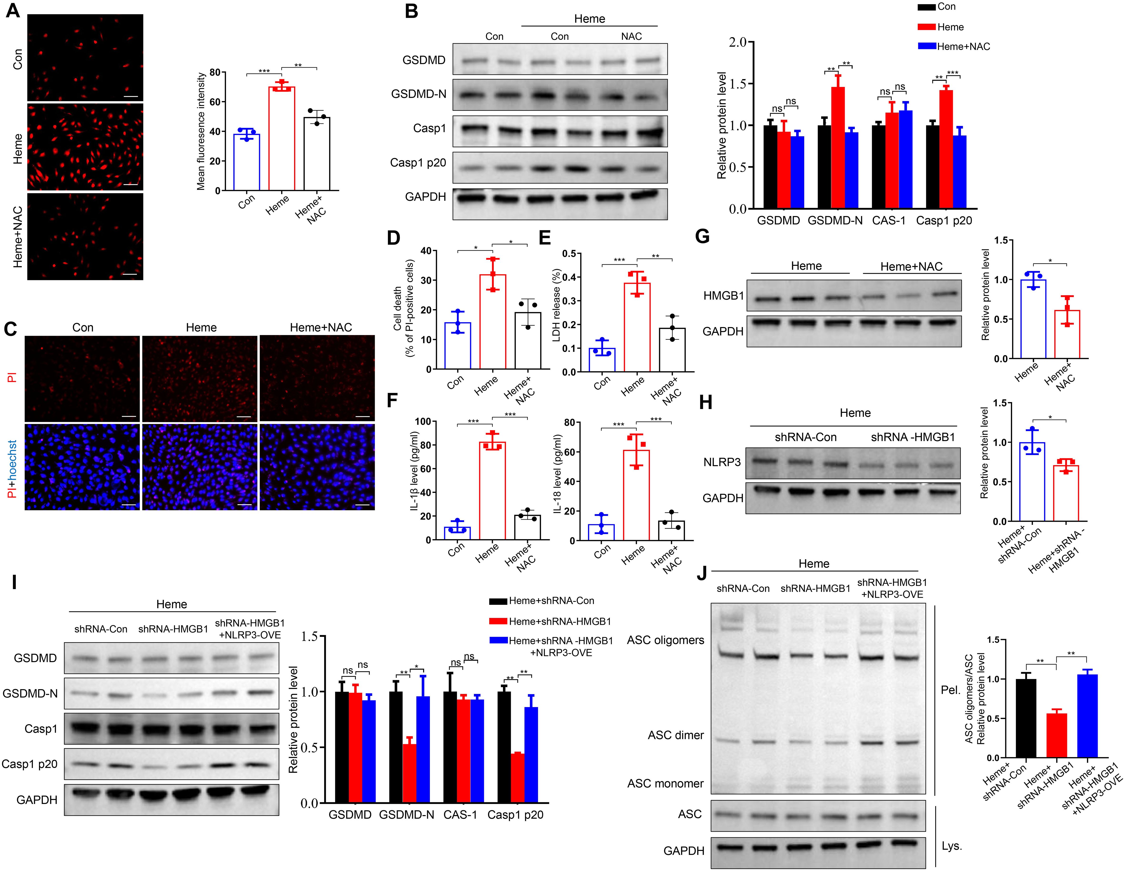 Figure 4. Heme regulates pyroptosis through ROS/HMGB1/NLRP3 pathway. (A) The ROS content in HUVECs was assayed after treatment of heme and NAC (n=3, by one-way ANOVA). Scale bar = 100 µm. (B) Protein levels of GSDMD, GSDMD-N, Casp1, and Casp1 p20 in HUVECs were assayed by Western blot assay after treatment of heme and NAC (n=3, by one-way ANOVA). (C) The HUVECs were stained with PI and Hoechst for 20 min to observe cell death after treatment of heme and NAC. Scale bar = 100 µm. (D) Cell death of HUVECs was assayed after treatment of heme and NAC (n=3, by one-way ANOVA). (E) The LDH level in supernatant of HUVECs was assayed after treatment of heme and NAC (n=3, by one-way ANOVA). (F) Levels of IL-1β and IL-18 in supernatant of HUVECs were assayed by ELISA after treatment of heme and NAC (n=3, by one-way ANOVA). (G) Protein level of HMGB1 in HUVECs with treatment of heme and NAC was detected by Western blot assay (n=3, by two-tailed Student’s t-test). (H) The protein level of NLRP3 in HMGB1 knockdown HUVECs was detected by Western blot assay after treatment of heme (n=3, by two-tailed Student’s t-test). (I) Protein levels of GSDMD, GSDMD-N, Casp1, and Casp1 p20 in HMGB1 knockdown and NLRP3 overexpression HUVECs were detected by Western blot assay after treatment of heme (n=3, by one-way ANOVA). (J) ASC oligomerization in cross-linked cytosolic pellets of HMGB1 knockdown and NLRP3 overexpression HUVECs was detected by Western blot assay after treatment of heme (n=3, by one-way ANOVA). The data are expressed as mean ± SEM. ns, no significance, *P < 0.05, **P < 0.01, ***P < 0.001.
