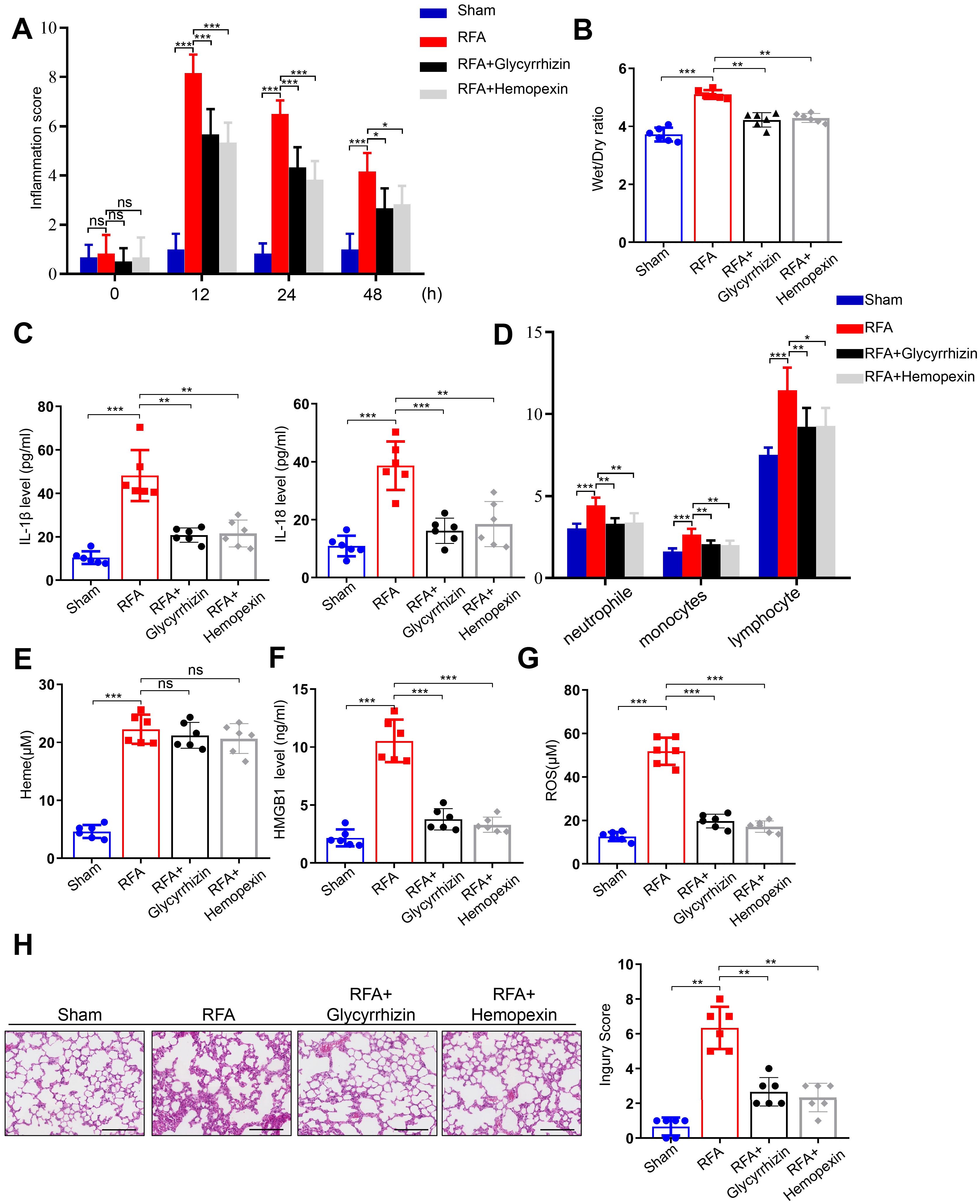 Figure 5. Glycyrrhizin and Hemopexin alleviate SIRS after RFA of hepatic hemangioma in mice. (A) The inflammation score of mice treated with glycyrrhizin or hemopexin was assayed at 0 h, 12 h, 24 h, and 48 h after RFA (n=6, by one-way ANOVA). (B) The wet-to-dry lung ratio of mice treated with glycyrrhizin or hemopexin was calculated after RFA (n=6, by one-way ANOVA). (C) The serum levels of IL-1β and IL-18 of mice treated with glycyrrhizin or hemopexin were detected by ELISA after RFA (n=6, by one-way ANOVA). (D) The neutrophile, monocyte, and lymphocyte counts of mice treated with glycyrrhizin or hemopexin were detected after RFA (n=6, by one-way ANOVA). (E–G) The serum levels of heme, HMGB1 and ROS of mice treated with glycyrrhizin or hemopexin were detected by ELISA after RFA (n=6, by one-way ANOVA). (H) The pathological changes of lung tissues of mice treated with glycyrrhizin or hemopexin were observed by HE staining after RFA (n=6, by one-way ANOVA). Scale bar = 50 µm. The data are expressed as mean ± SEM. ns: no significance, *P < 0.05, **P < 0.01, ***P < 0.001.