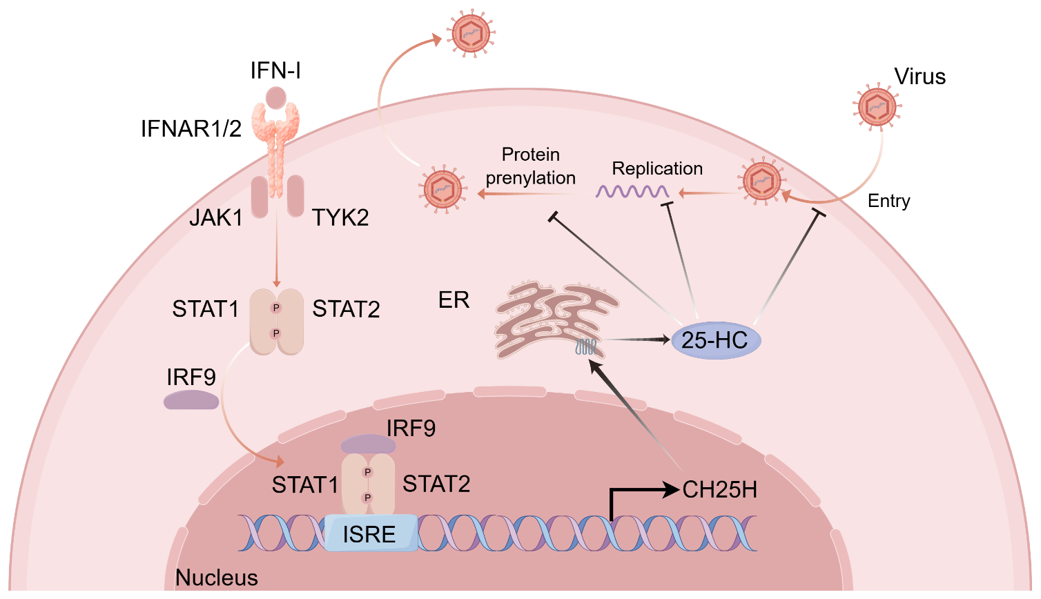 The type I interferon induces 25-HC expression to exert antiviral effects. Upon binding of IFN-I to their receptor complex IFNAR1/2, the receptor-associated tyrosine kinases JAK1 and TYK2 are activated, leading to the phosphorylation of the downstream transcription factors STAT1 and STAT2. The phosphorylated STAT1/STAT2 heterodimer subsequently associates with IRF9 to form the heterotrimeric complex ISGF3, which translocates into the nucleus and binds to ISREs, thereby initiating the transcription of a broad array of ISGs. Among these, CH25H, a prototypical ISG located in the ER, catalyzes the conversion of cholesterol into 25-HC. 25-HC establishes a multilayered antiviral barrier through multiple mechanisms: it lowers the cholesterol content of cellular membranes to inhibit viral attachment and entry; it suppresses viral genome replication; and it antagonizes protein prenylation of both viral and host factors involved in viral replication and assembly, while altering intracellular cholesterol distribution in the ER to further impede viral assembly and packaging. IFN-I, type I interferon; IFNAR1/2, interferon-α receptor subunit 1/2; JAK1, Janus kinase 1; TYK2, tyrosine kinase 2; STAT1/STAT2, signal transducer and activator of transcription 1/2; IRF9, interferon regulatory factor 9; ISGF3, interferon-stimulated gene factor 3; ISRE, interferon-stimulated response element; ISG, interferon-stimulated gene; CH25H, cholesterol-25-hydroxylase; 25-HC, 25-hydroxycholesterol; ER, endoplasmic reticulum.
