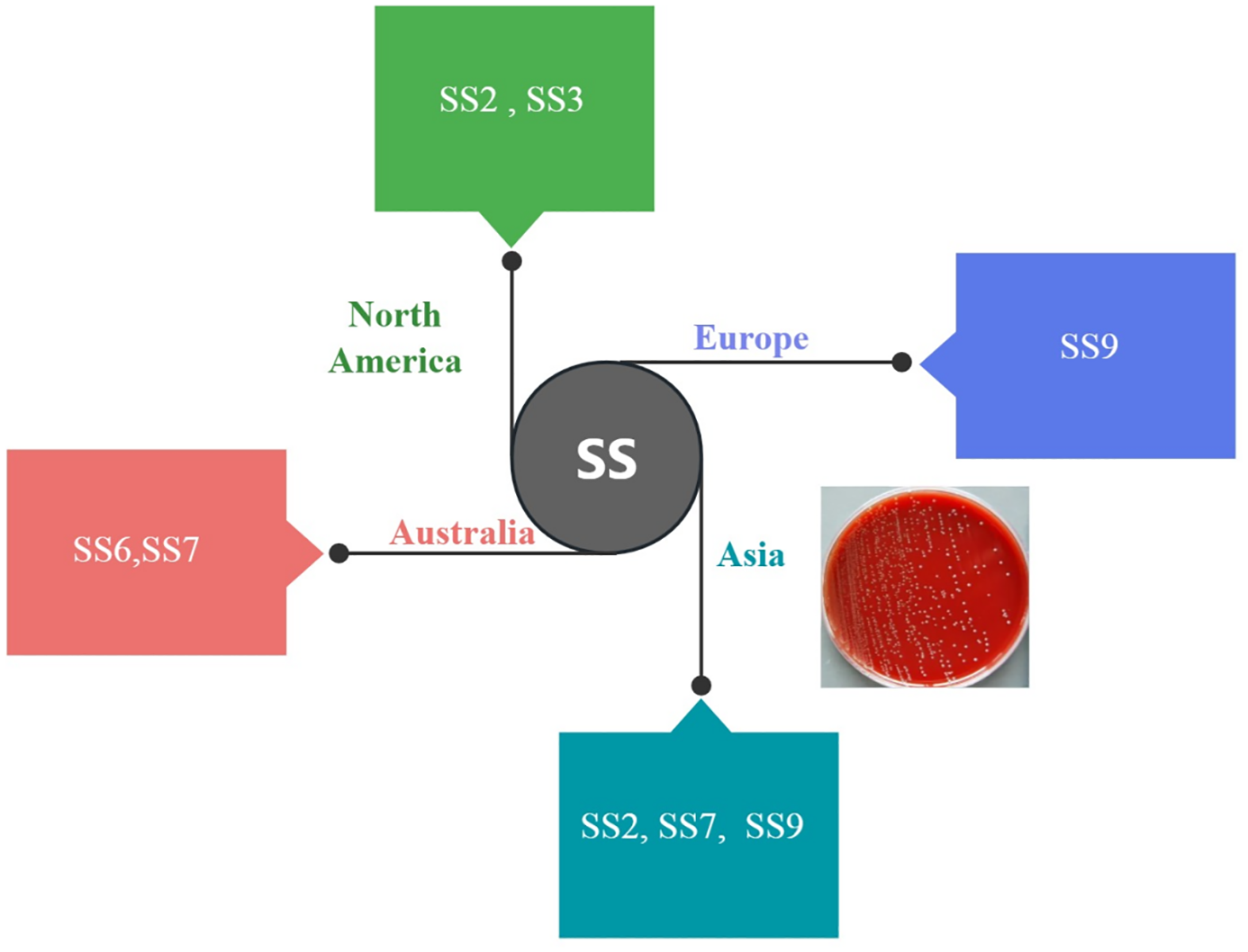 Global distribution of predominant Streptococcus suis serotypes in human infections. Pie charts illustrate the relative frequency of SS serotypes most commonly associated with human cases across major geographic regions. The notable regional variation in serotypes underscores the challenge in developing a universally effective vaccine.