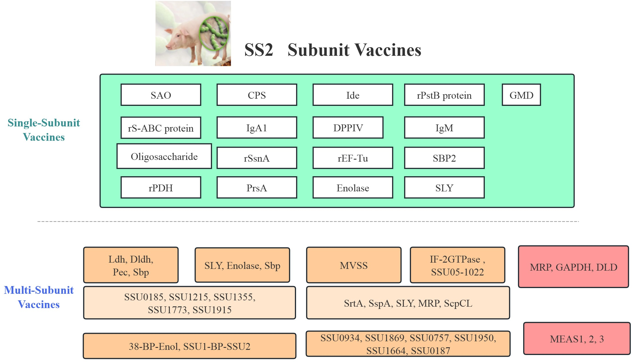 Comprehensive classification and evaluation of Streptococcus suis subunit vaccines and associated animal models. This figure summarizes various vaccine strategies including single antigen vaccines and multi-subunit formulations.