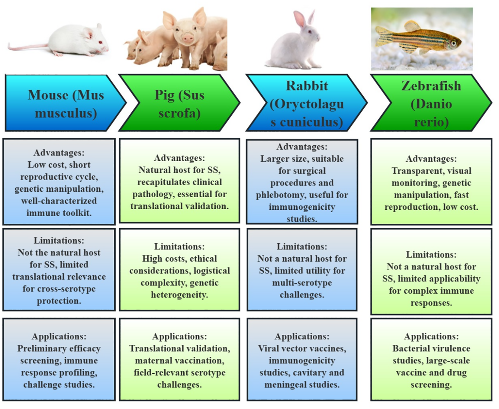 In the development of subunit vaccines for S. suis, a variety of animal models have been employed to evaluate efficacy, immunogenicity, and protection. These models include mice, pigs, rabbits, and zebrafish, each with distinct roles, advantages, and limitations, as shown in Figure 3.