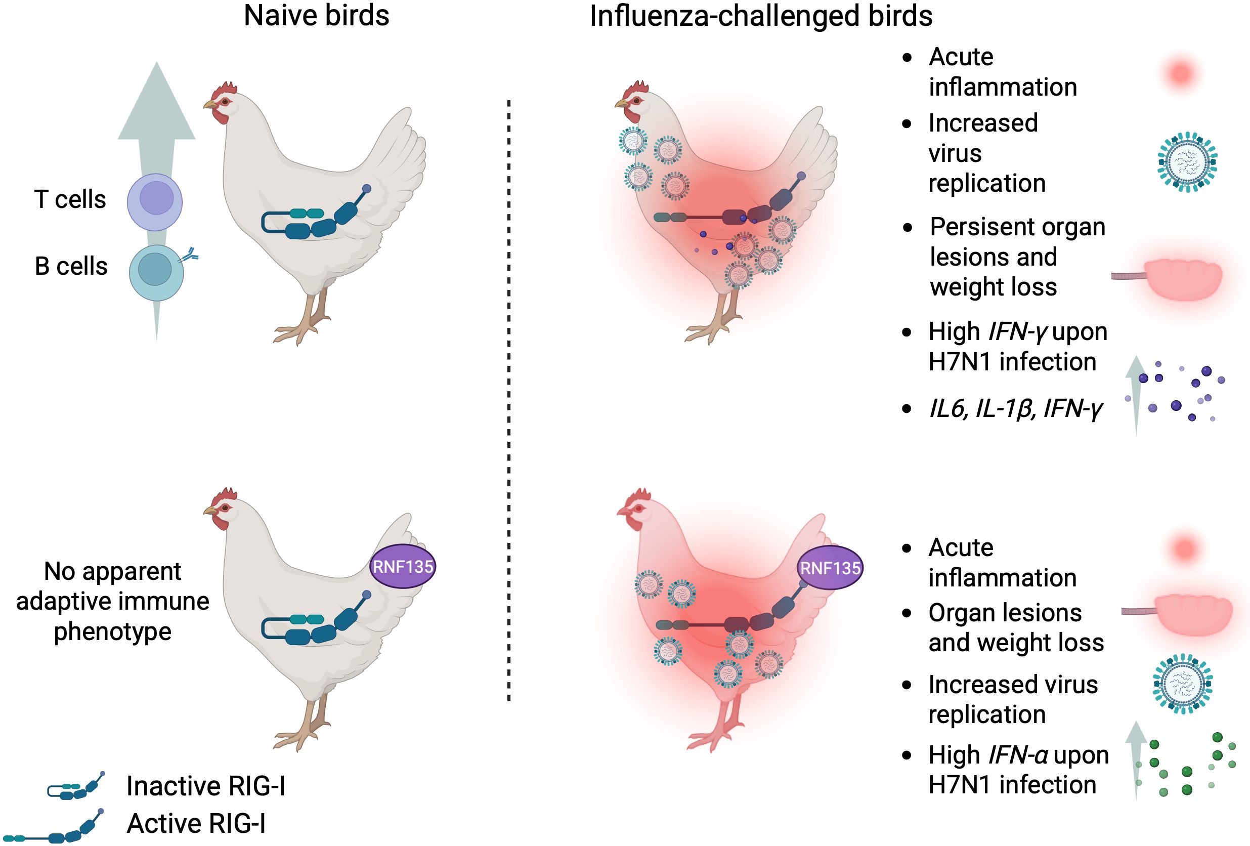 Retinoic acid-inducible gene I (RIG-I) activates mitochondrial antiviral signaling proteins, initiating the antiviral response. RIG-I and RNF135, a ubiquitin ligase regulator, are missing in domestic chickens but conserved in mallard ducks. The chickens’ RIG-I loss was long believed to be linked to increased avian influenza susceptibility. We reinstated both genes in chickens and examined their susceptibility to infection with an H7N1 avian influenza virus. Uninfected RIG-I-expressing chickens exhibited shifts in T and B cells. At the same time, the H7N1 infection led to severe disease, persistent weight loss, and increased viral replication. The simultaneous expression of RIG-I and RNF135 potentiated the RIG-I activity and was associated with exacerbated inflammatory response and increased mortality without influencing virus replication. Additional animal infection experiments with two other avian influenza viruses validated these findings. They confirmed that the harmful effects triggered by RIG-I or RIG-I-RNF135-expression require a minimum degree of viral virulence. Our data indicate that the loss of RIG-I in chickens has likely evolved to counteract deleterious inflammation caused by viral infection and highlight an outcome of restoring evolutionary lost genes in birds.