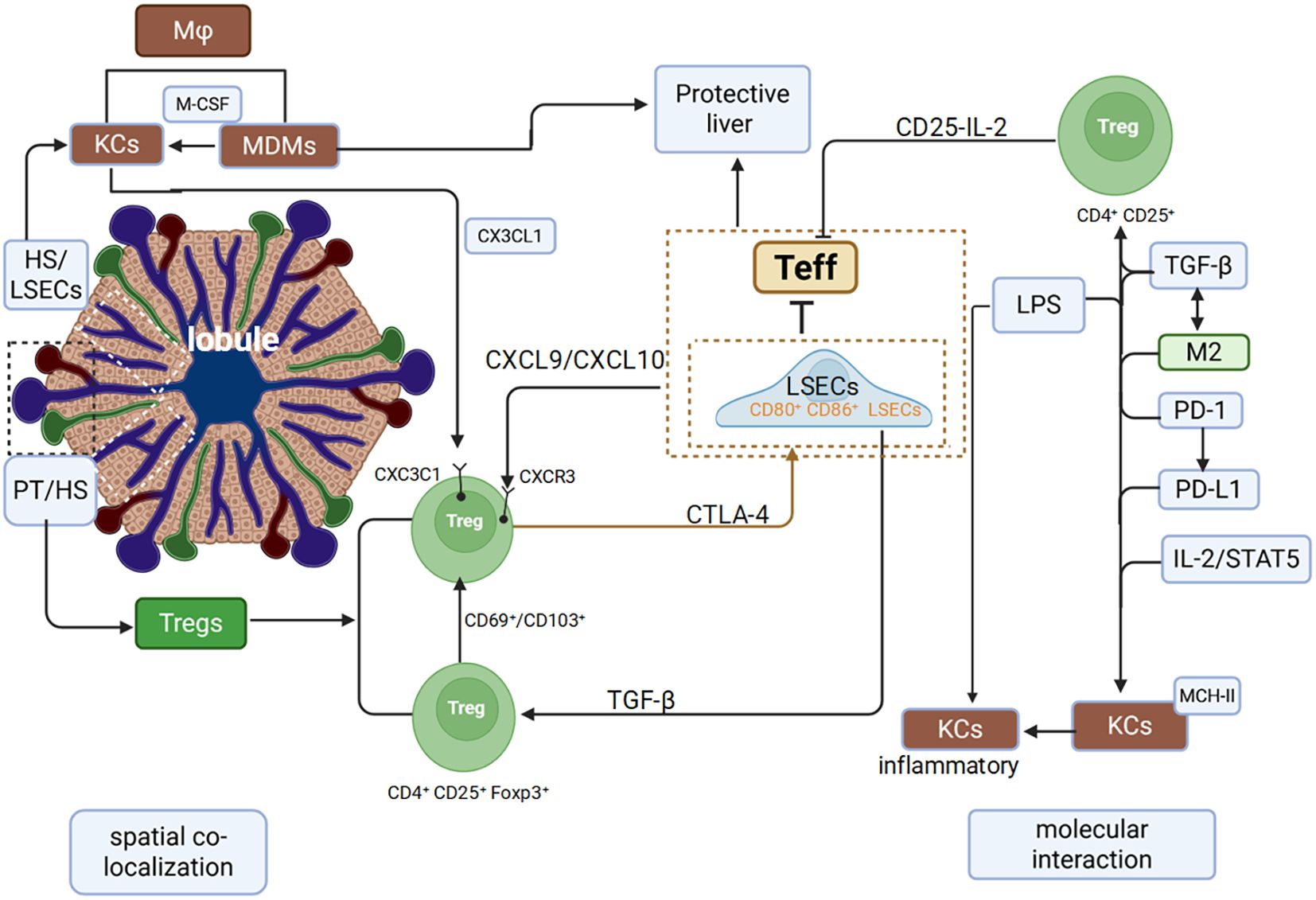Under physiological conditions, hepatic immune homeostasis is maintained through a three-dimensional framework of “source complementarity-spatial co-localization-molecular interaction” between Macrophages and Tregs. These three layers function in a logically sequential and mutually reinforcing manner, forming a highly efficient immunoregulatory system.