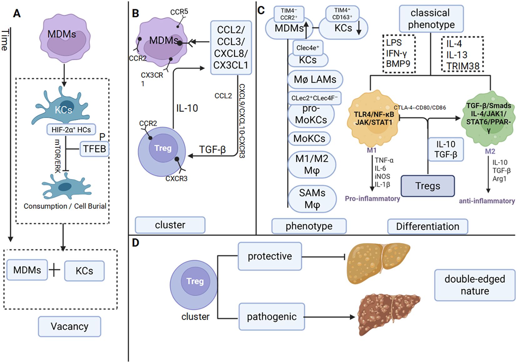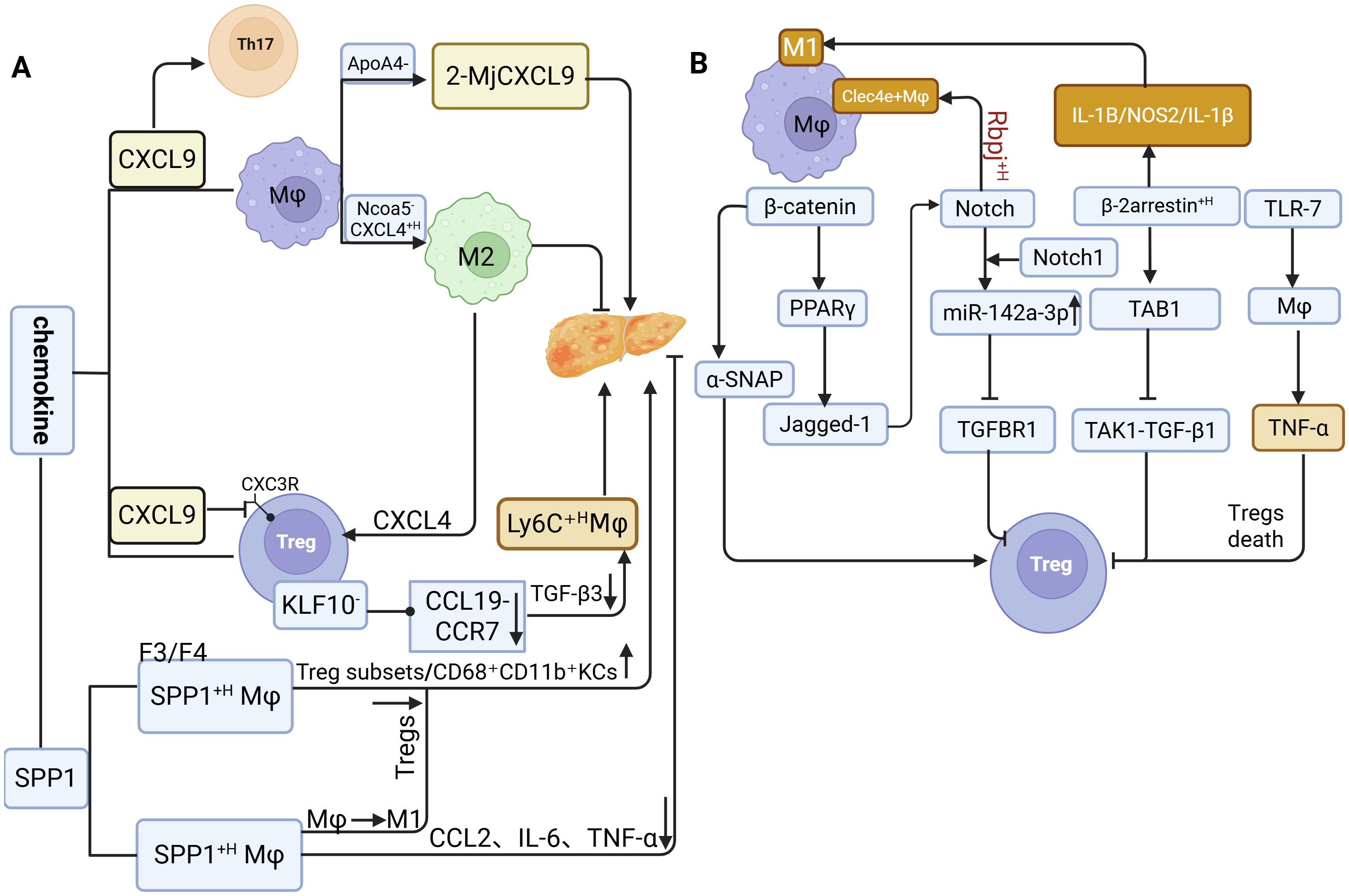The dynamic balance between Macrophages and Tregs is essential for maintaining hepatic immune homeostasis, and their aberrant crosstalk constitutes a central mechanism driving MASLD progression. This interplay involves Macrophages recruitment, phenotypic differentiation, and quantitative changes in Tregs, orchestrated through networks of chemokines, cytokines, and signaling pathways. Dysregulation across these levels promotes the transition from hepatic inflammation to fibrosis.