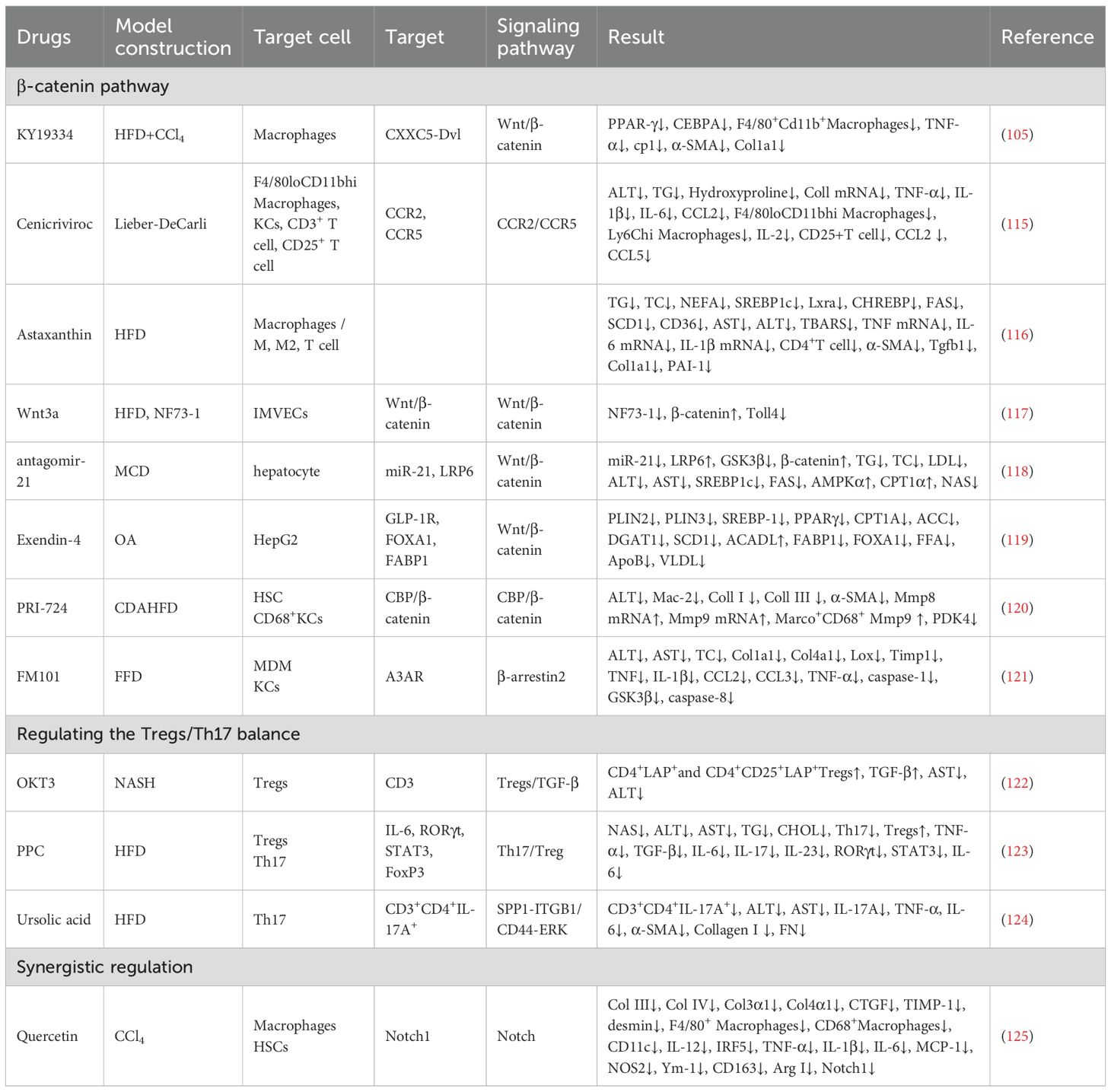 Targeting Notch1 signaling can further coordinate Macrophages polarization and Tregs function. Notch1M-KO alleviates steatosis and restores Tregs proportions (13). Quercetin suppresses Notch1 expression, reducing F4/80+ and CD68+ Macrophages infiltration, downregulating M1 markers (CD11c, IL-12, IRF5) and pro-inflammatory cytokines (TNF-α, IL-1β, IL-6, monocyte chemoattractant protein-1 (MCP-1), NOS2), while lowering M2-associated proteins (Ym-1, CD163, Arg I) and fibrotic indicators (Col3α1, Col4α1, CTGF, TIMP-1) (125). (Table 1).