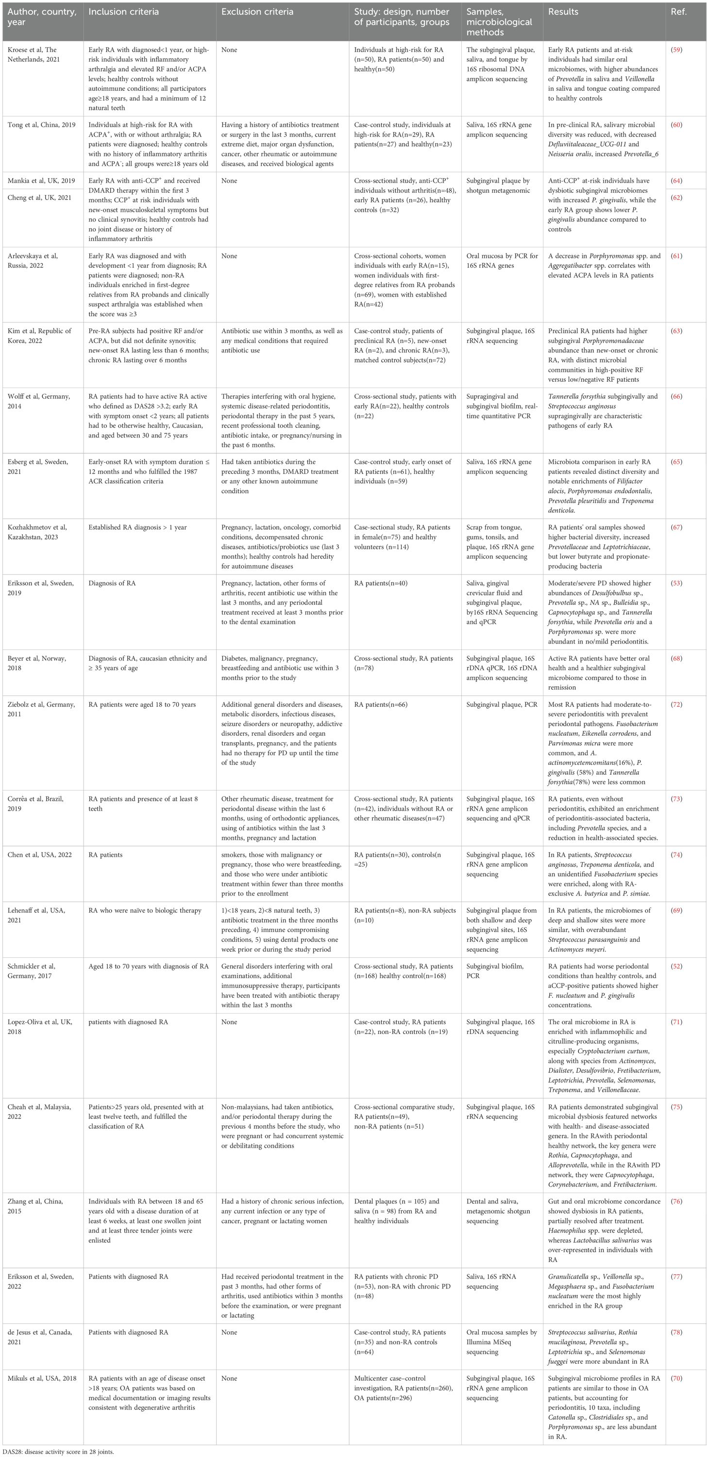 The oral microbiota is a highly diverse and structured microbial community comprising over 700 bacterial species, including more than 250 recognized pathogens, which can influence host pathophysiology on a systemic level (57). Factors such as aging, poor oral hygiene, systemic comorbidities, and the use of medications can disrupt the composition of the oral microbiota, contributing to the onset of oral diseases (58). Over the past two decades, a growing number of clinical studies have examined the oral microbial characteristics of individuals at high risk of developing RA and of patients already diagnosed with the condition (summary provided in Table 1), revealing a potential link between oral microbial dysbiosis and RA pathogenesis.