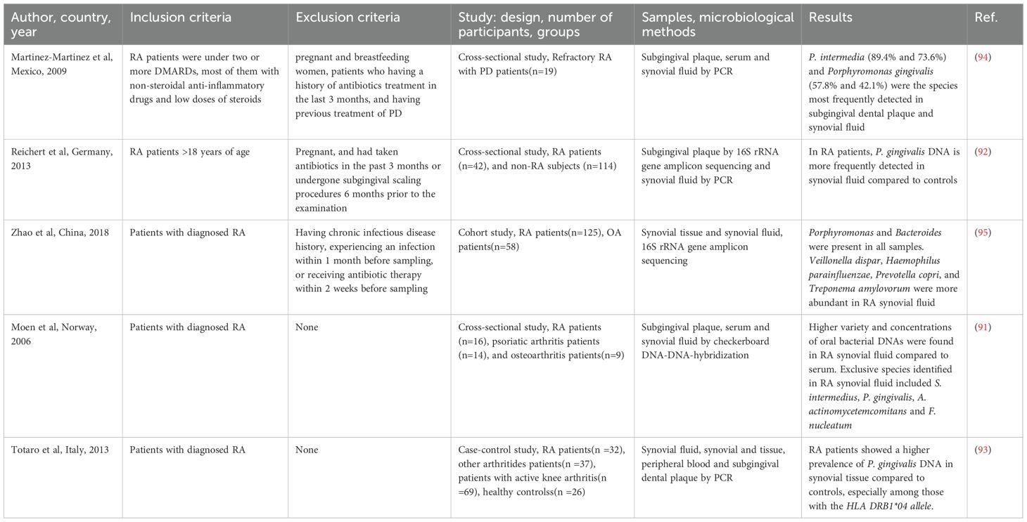 Table 4. Studies in humans on the association periodontal microorganisms Porphyromonas gingivalis and RA.