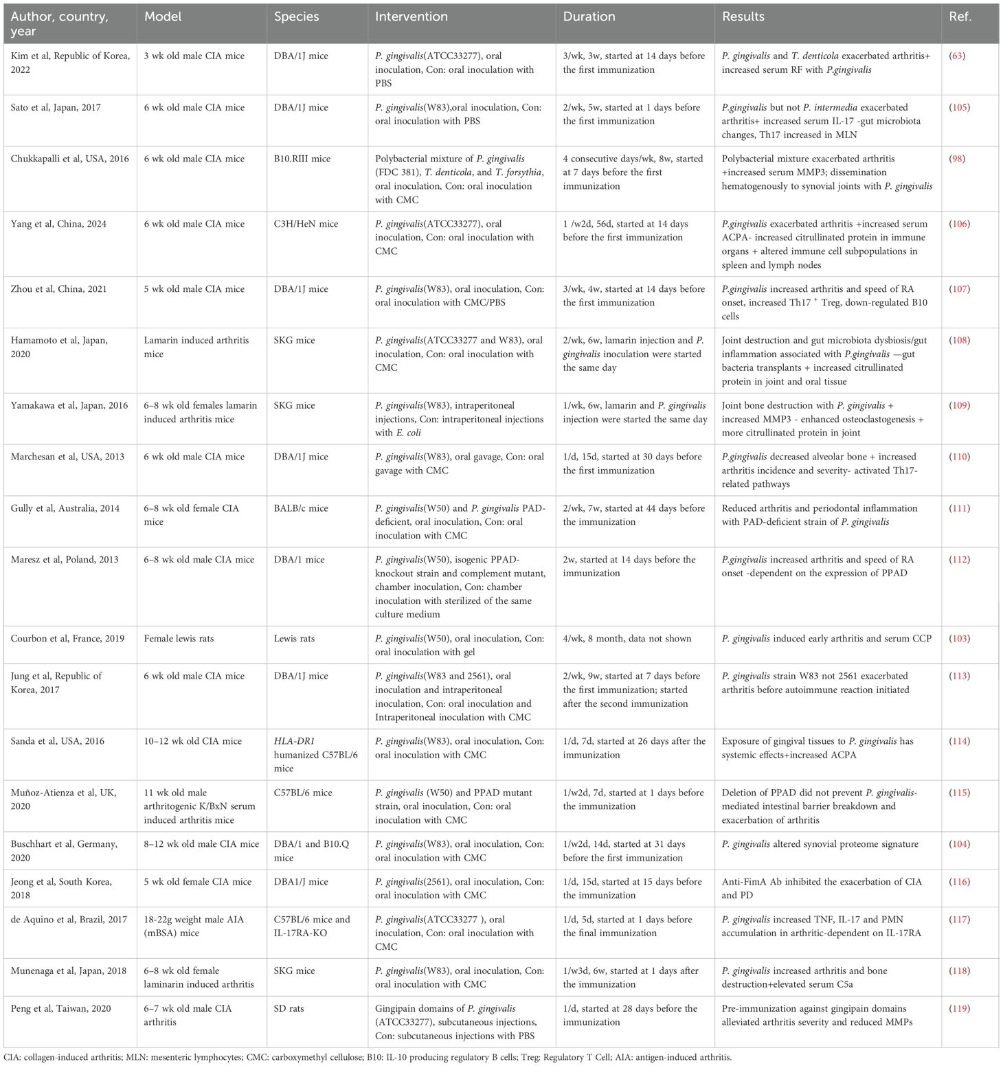 Although many oral bacteria have been linked to RA, P. gingivalis is the most extensively studied species in terms of its impact on arthritis progression in animal models. As the predominant pathogen in subgingival polymicrobial communities associated with PD, P. gingivalis has been the focus of numerous experimental investigations in this field. Various arthritis models incorporating P. gingivalis infection have been employed to simulate its differential effects on RA. In these models, variations in immunization protocols, bacterial dosages, and routes of administration can markedly influence experimental outcomes. Moreover, the timing of arthritis induction relative to periodontal infection introduces additional complexity to experimental design, making reproducibility and interpretation particularly challenging. Twenty-three studies have examined the effect of P. gingivalis infection on the progression of RA using animal models (Table 3). Seventeen studies reported that P. gingivalis exacerbated arthritis, while four studies investigated the role of P. gingivalis combined with other oral pathogens, with three showing synergistic effects and one showing no significant effect on pristane-induced arthritis (98, 100, 101). Three reported synergistic effects, while one found no significant effect on pristane-induced arthritis (102). One study showed that oral inoculation with P. gingivalis led to the onset of seropositive arthritis, systemic inflammation, and bone erosion over an 8-month observation period (103). Additional study suggested that P. gingivalis failed to worsen arthritis but altered synovial proteome characteristics, suggesting that oral pathogens may contribute to the formation of particular disease subtypes (104). These studies had highly variable designs, using different P. gingivalis strains, models, and time points.