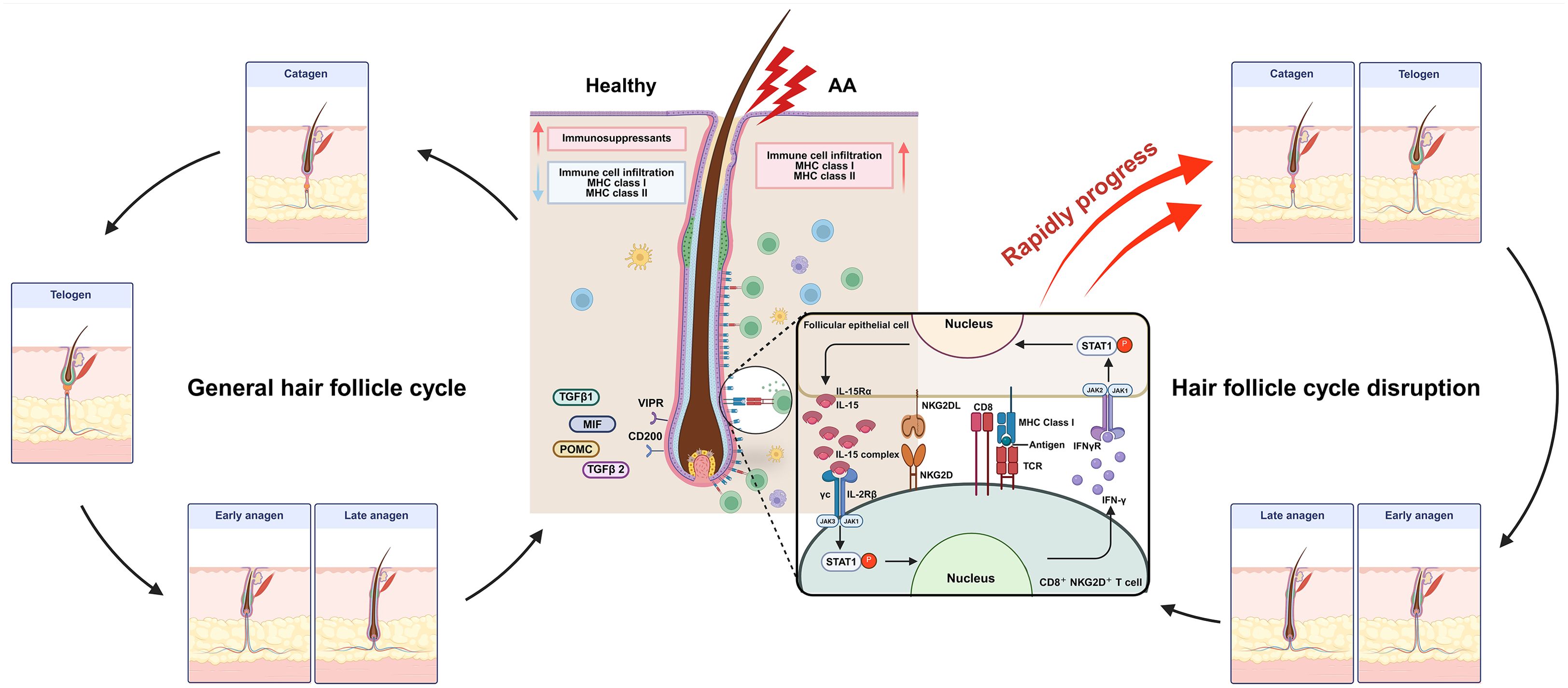 The proximal region (bulge) of a healthy hair follicle maintains an immune-privileged status by suppressing MHC class I expression, limiting the activity of Langerhans cells (LCs), and through the action of immunosuppressive cytokines and hormones. This immune privilege effectively prevents the infiltration of immune cells, such as CD8+ and CD4+ T cells as well as natural killer (NK) cells, thereby protecting the follicle from immune-mediated attacks (2, 4). In AA, the collapse of this follicular immune privilege is considered a key pathogenic mechanism. Proinflammatory cytokines, including IFN-γ, TNF, IL-12, IL-15, and IL-18, along with cytotoxic molecules like granzyme B (GzmB) and perforin, play crucial roles in the progression of AA (5–7). These immune mediators disrupt follicular immune privilege and induce premature transition of the hair cycle into the catagen or telogen phase. Consequently, they promote immune cell–mediated attacks on the hair bulb, leading to hair loss and AA lesion formation (2).