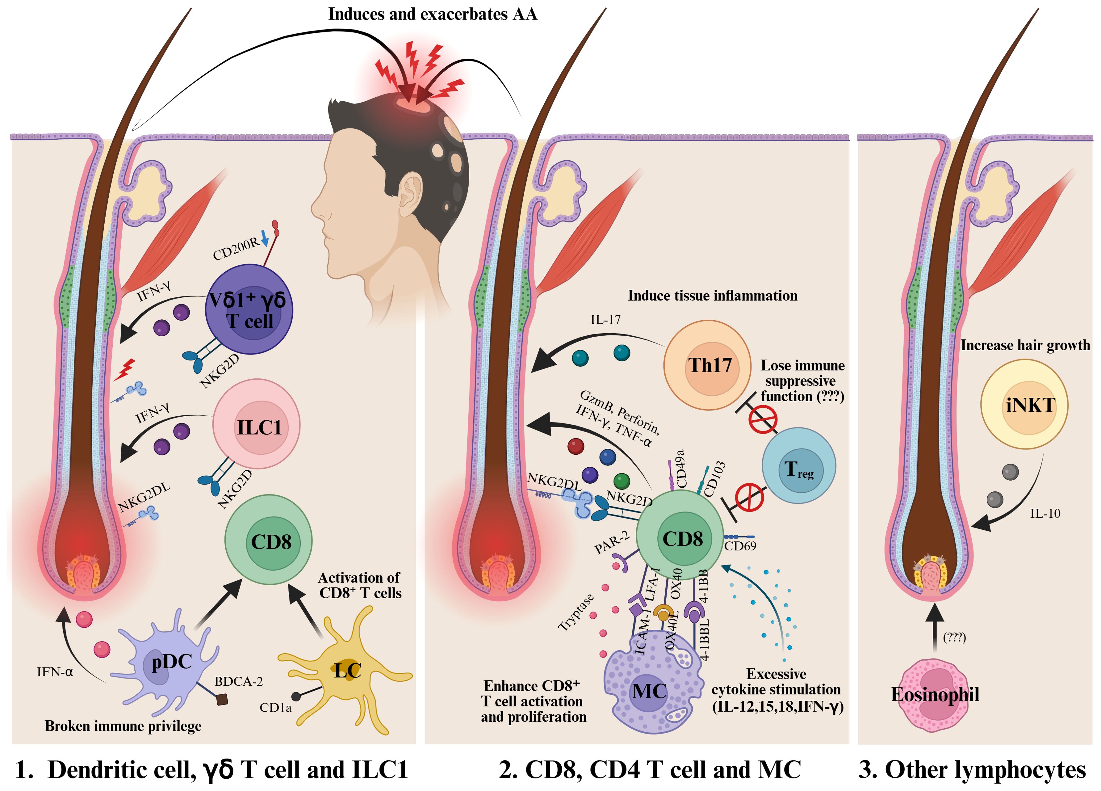 AA is an autoimmune disorder primarily driven by the collapse of immune privilege in hair follicles and the subsequent activation of cytotoxic immune responses, particularly involving NKG2D+ CD8+ T cells. Recently, the roles of innate immune cells such as MCs, DCs, ILC1, and γδ T cells in AA pathogenesis have received increasing attention (Figure 2). These findings highlight the potential for developing cell-specific or combination immunotherapies targeting these innate immune populations.