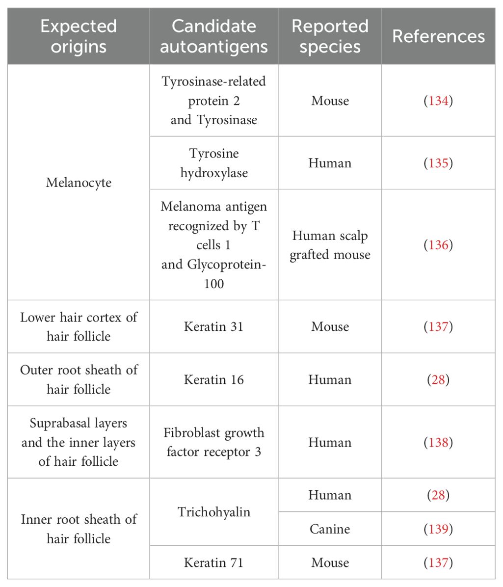 In AA, the relationship between CD8+ T cell pathogenicity and clonality has long been a central topic of investigation. De Jong et al. (24) showed that CD8+ T cell clonality was significantly increased at AA onset in a skin graft model using C3H/HeJ mice. In human patients with AA as well, clonally expanded T-cell clones have been detected in both the blood and scalp, and the extent of clonal expansion has been shown to correlate with disease severity. More recently, a study by Dai et al. (25) demonstrated that a single clonotypic CD8+ T cell expressing a defined T cell receptor (TCR) αβ sequence was sufficient to induce AA, providing direct evidence of a causal relationship between T-cell clonality and disease pathogenesis. Additionally, TCR sequencing of T-cell samples collected from the scalp and peripheral blood before and approximately 6 months after tofacitinib treatment revealed that although the frequency of most expanded T-cell clones decreased after treatment, a subset of clones persisted (24). These findings support the hypothesis that, in AA and other inflammatory skin disorders, disease recurrence may be driven by the reactivation of residual clonally expanded T cells or TRM cells upon re-exposure to antigens. Indeed, the presence of autoantibodies and T cells reactive to candidate autoantigens has been reported in patients with AA (26–28). Although the autoantigens involved in AA have not yet been precisely identified, several candidate autoantigens proposed to date have been derived from keratinocytes and melanocytes of the hair follicle (Table 1) (29). Elucidating the role of antigen-specific CD8+ T cells in hair follicle destruction remains a critical area of ongoing research.