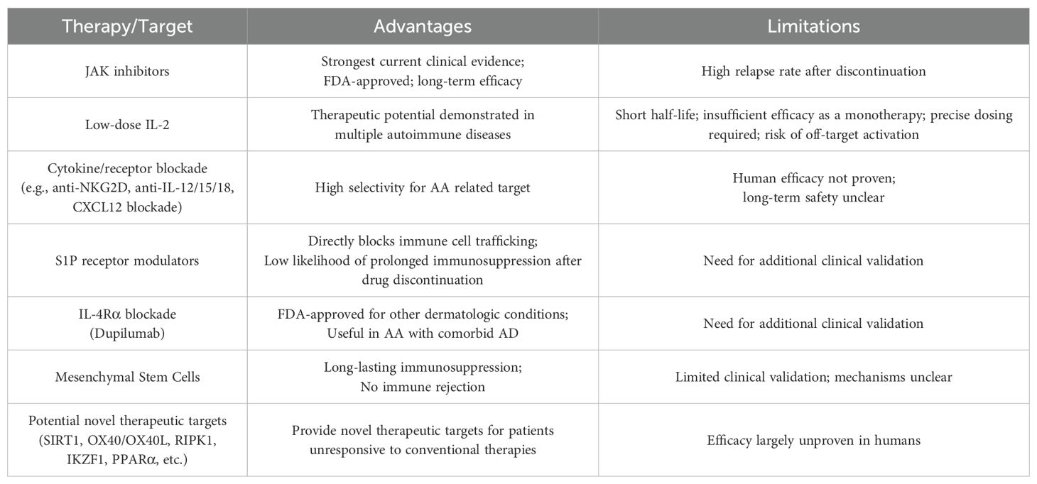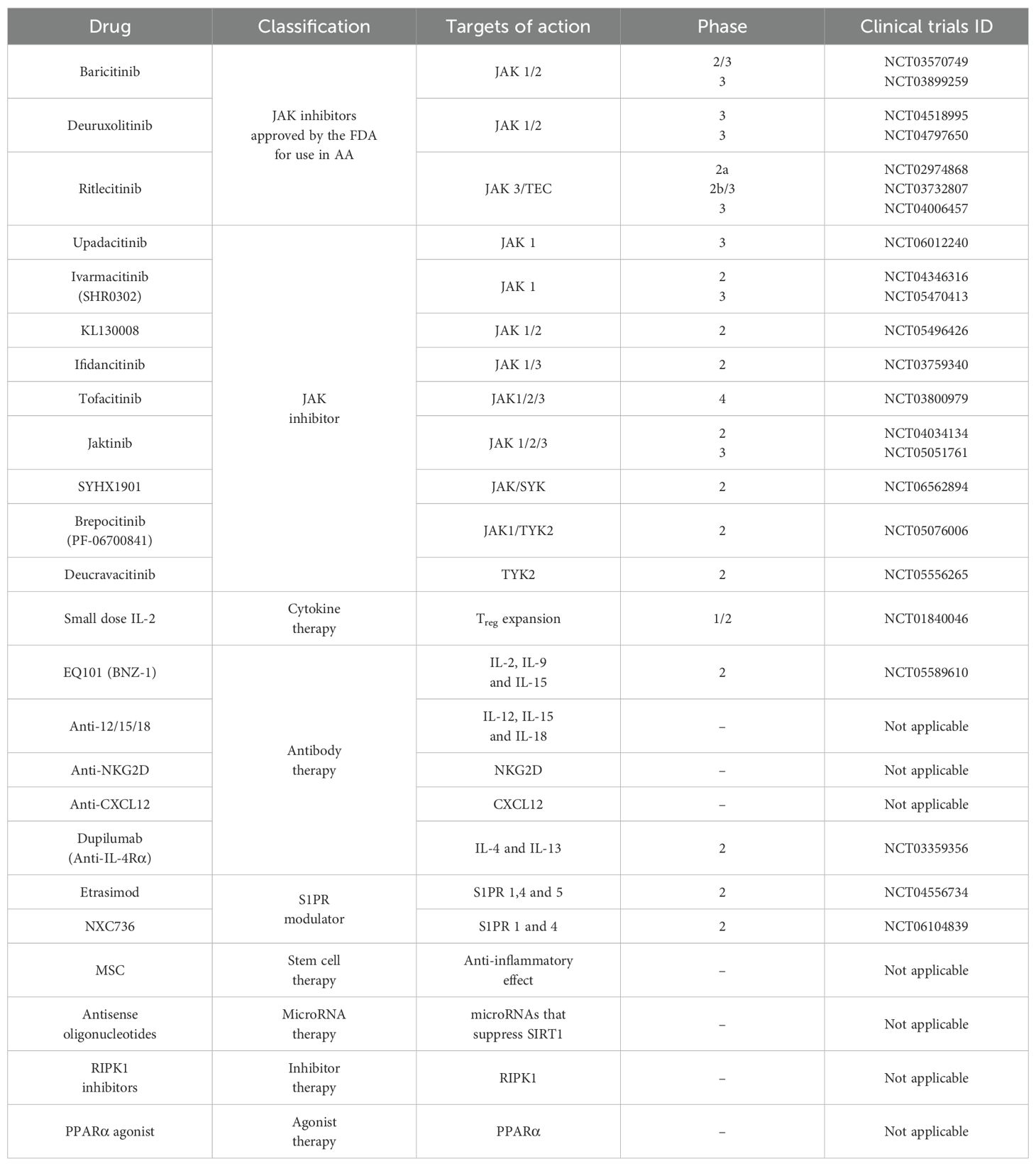 Treatment options for AA include diphenylcyclopropenone (8), glucocorticoids (9), methotrexate (10), and cyclosporine (11). Excimer laser therapy has also been used as an adjunctive treatment (12). In recent years, small-molecule drugs, such as Janus kinase (JAK) inhibitors have been introduced as therapeutic agents (13). However, these treatments are often associated with disease relapse, limited efficacy, and low patient adherence, highlighting the need for more effective and sustainable therapeutic options. In this review, we discuss the immune mechanisms underlying AA and examine newly proposed therapeutic strategies and potential targets based on recent findings.