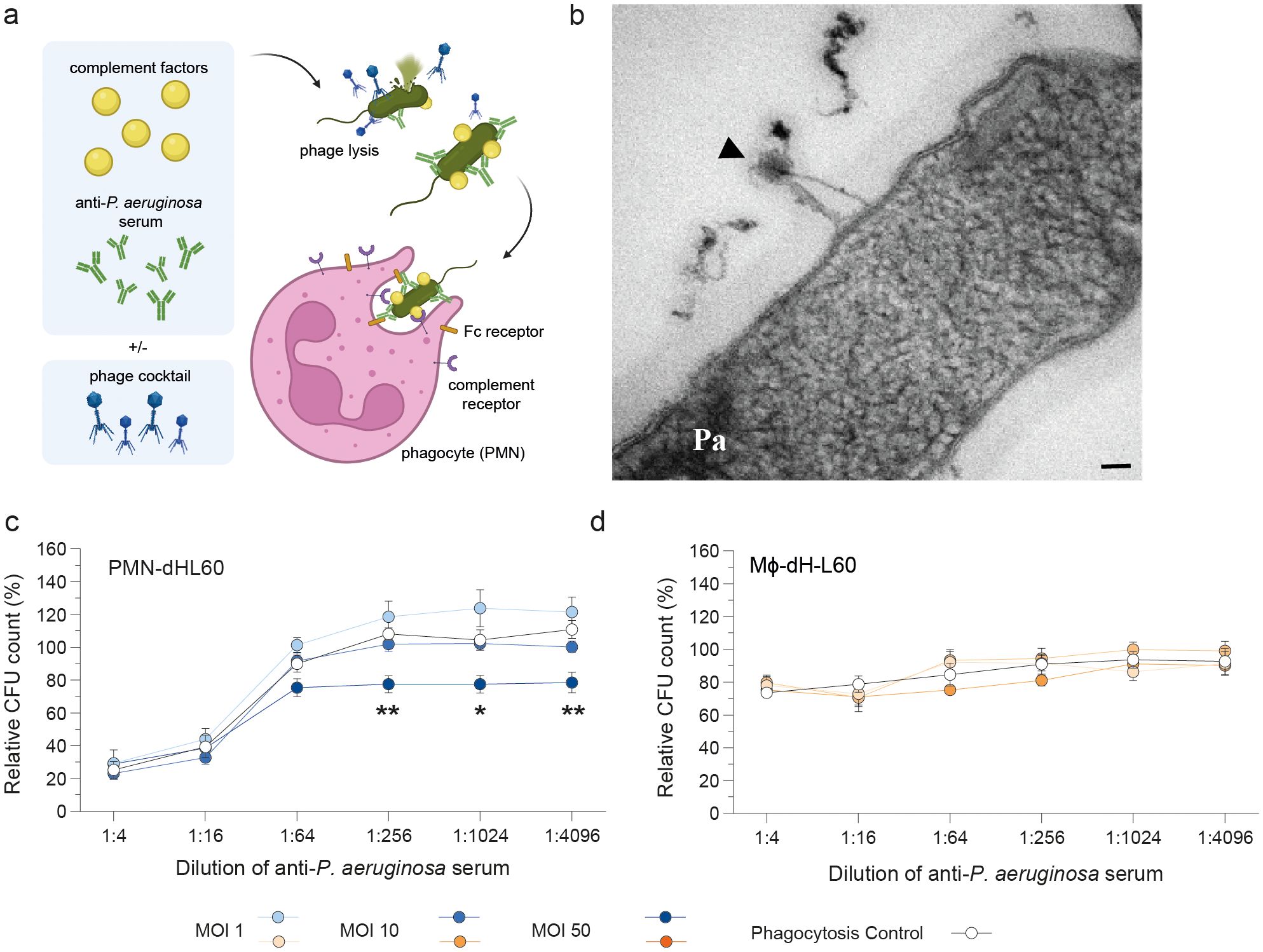 Figure 1. Efficacy of opsonophagocytosis is strengthened by phages in vitro. (a) Graphical abstract created with BioRender.com. The in vitro opsonophagocytic killing assay (OPKA) was used for the determination of the phagocytosis rate of differentiated neutrophil-like cells (PMN-dHL-60) or macrophage-like cells (Mϕ-dHL-60). P. aeruginosa (PAO1) were incubated with serial dilutions of anti-Pseudomonas specific antibodies (serum) for 15 min (37 °C, 200 rpm) followed by the addition of baby rabbit complement, dHL-60 cells and the Pseudomonas-specific phage cocktail in indicated concentrations. (b) Transmission electron microscopy visualization shows phage (JG005/JG024; shown by black arrowhead) binding to PAO1 bacteria. Scale bar 50 nm. (c, d) Relative bacterial load (CFU, colony-forming unit) of the OPKA was quantified after 90 min incubation. Samples with dHL-60, serum and complement factors, but no phages serve as (opsono)phagocytosis control. Data determined by 2-way ANOVA with Dunnett´s multiple comparisons test: *p < 0.05; **p < 0.01; n = 4-5. MOI, multiplicity of infection. Pa, P. aeruginosa strain PAO1.