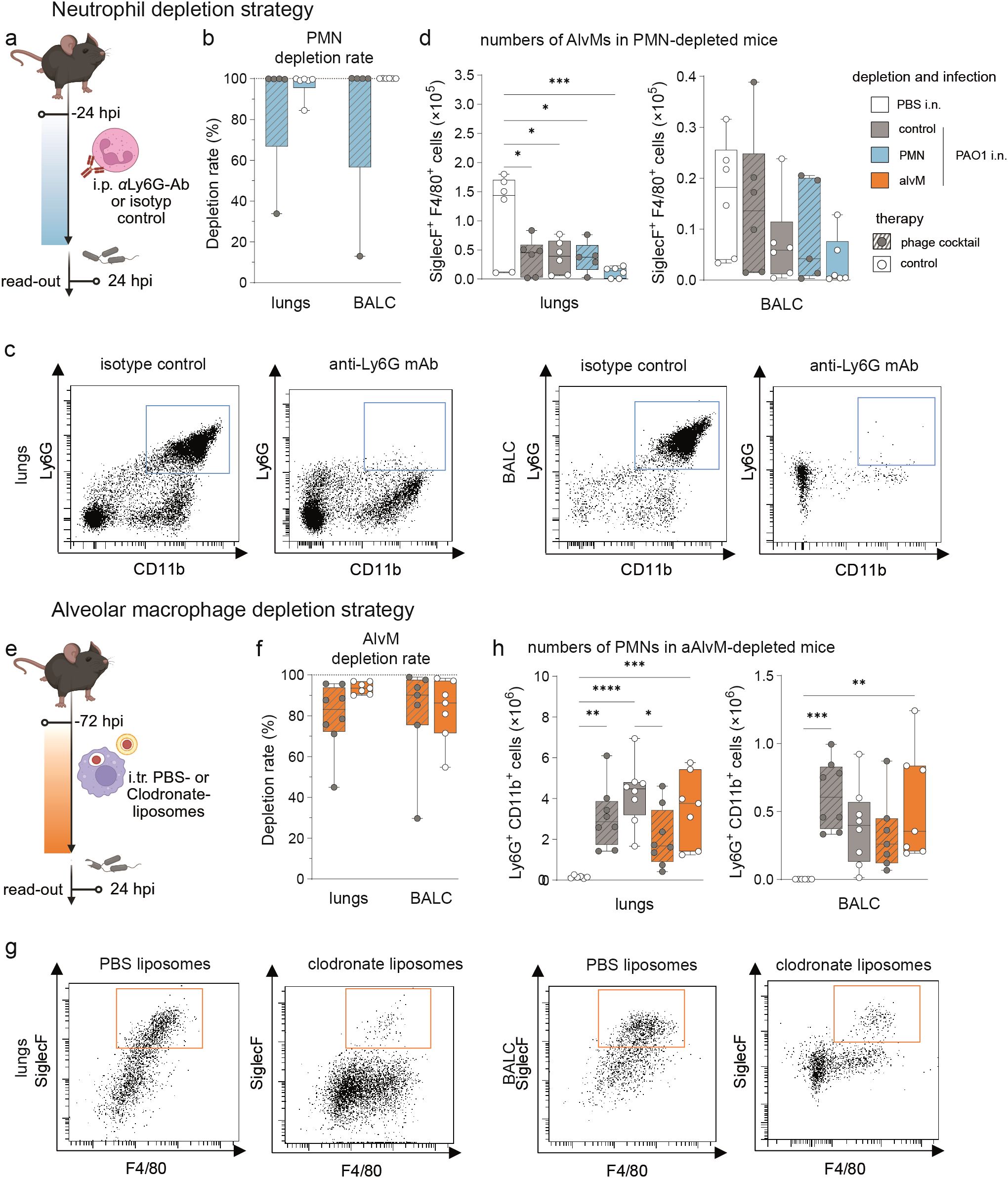 Figure 2. In vivo phagocytes depletion strategies. Naive mice (C57BL/6J WT, female, 8–10 weeks; Janvier Labs) were depleted for (a) neutrophils (PMNs) via intraperitoneal (i. p.) application of InVivoPlus anti-mouse Ly6G antibody (clone 1A8; Bio X Cell, Lebanon, USA) or InVivoPlus rat IgG2a, κ isotype control (clone 2A3; Bio X Cell, Lebanon, USA) 24 hours or (e) alveolar macrophages (AlvM) via intratracheal (i. t.) application of Clodronate- or PBS-filled liposomes as control (Liposoma BV, Amsterdam, Netherlands) 72 hours before infection. Experimental plans created with BioRender.com. (b, f) Depletion rates in percent of lungs and BAL cells (BALC). Depletion rates were determined by calculating the ratio of PMNs or AlvM counts in individual depleted animals to the mean PMNs or AlvM count of the corresponding undepleted control group. (c, g) Representative dot blots of the flow cytometry analysis at 24 hours post infection (hpi). Numbers of (d) AlvMs and (h) PMNs determined by flow cytometry. One-way ANOVA, Tukey’s multiple comparisons test. *p < 0,05, **p < 0,01, ***p < 0,001, ****p < 0,0001; depletion control: n = 6 isotype control (d) or n = 6 PBS-liposomes (h), sham-infected, control treated mice (white), depletion controls: n = 6 isotype control (d) or n = 8 PBS-liposomes (h), PAO1-infected mice with phage treatment (grey, dashed lines), depletion controls: n = 6 isotype control (d) or n = 8 PBS-liposomes (h), PAO1-infected, control treated mice (grey), n = 5 mice with PMN cell depletion, PAO1-infection and phage treatment (blue, dashed lines), n = 6 mice with PMN depletion, PAO1-infection and control treatment (blue), n = 8 mice with AlvM depletion, PAO1-infection and phage treatment (orange, dashed lines), n = 7 mice with AlvM cell depletion, PAO1-infection and control treatment (orange). BAL, bronchoalveolar lavage.