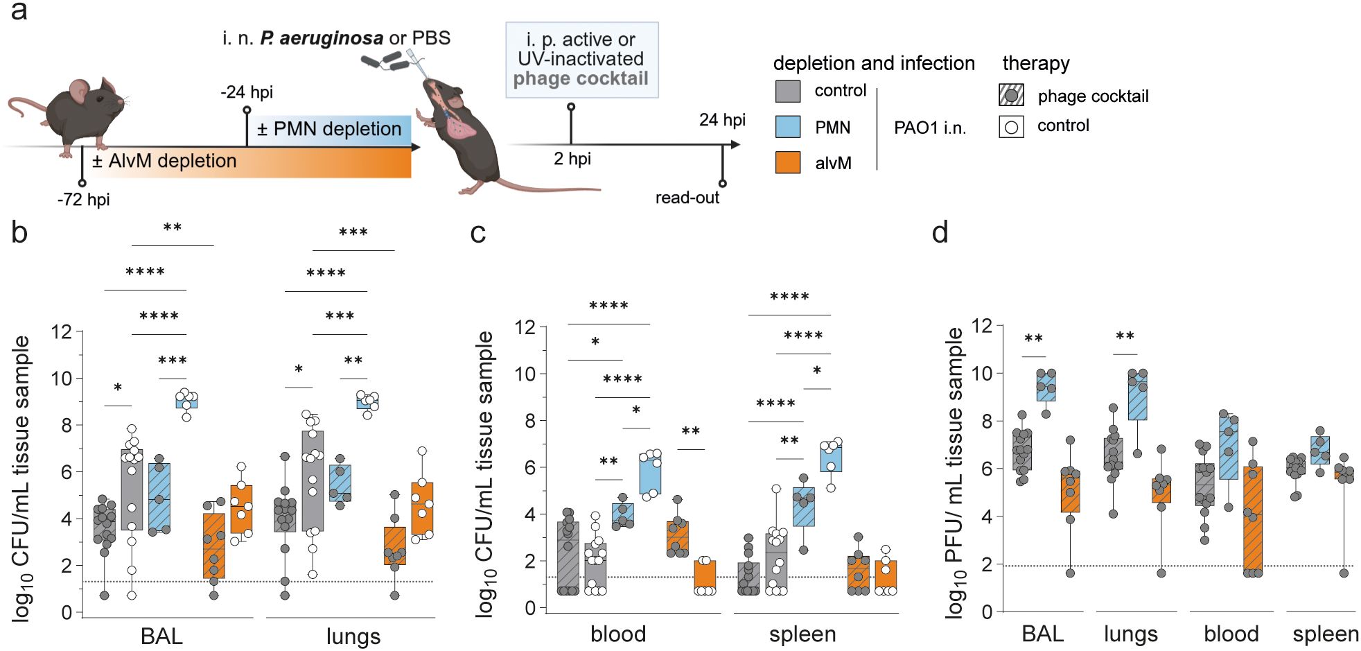 Figure 3. Antimicrobial synergy between phages and innate immune cells. (a) Experimental Plan created with BioRender.com. Naive mice (C57BL/6J WT, female, 8–10 weeks; Janvier Labs) were depleted for alveolar macrophages (AlvM) via intratracheal (i. t.) application of Clodronate- or PBS-filled liposomes as control (Liposoma BV, Amsterdam, Netherlands) 72 hours (h) or neutrophils (PMNs) via intraperitoneal (i. p.) application of InVivoPlus anti-mouse Ly6G antibody (clone 1A8; Bio X Cell, Lebanon, USA) or InVivoPlus rat IgG2a, κ isotype control (clone 2A3; Bio X Cell, Lebanon, USA) 24 h before infection. Mice were intranasally (i. n.) infected with PAO1 (5 × 106/20 µL), while sham-infected mice received PBS as control, followed by one intraperitoneal (i. p.) treatment at 2 h post infection (hpi) with a Pseudomonas-specific phage cocktail (approx. 5 × 107 PFU/phage per injection). Analysis time point was 24 hpi. Graphs displaying (b, c) bacterial loads and (d) phage titers at 24 hpi in indicated organs (BAL, homogenized half lungs (right), blood, spleen). Results are shown as box plots depicting median, quartiles, and range. Two-way ANOVA with Tukey’s multiple comparisons test. Significance not shown between PMN and alvM: *p < 0,05, **p < 0,01, ***p < 0,001, ****p < 0,0001; n = 12 control undepleted, sham-infected, control treated mice (white), n = 14 control undepleted, PAO1-infected mice with phage treatment (grey, dashed lines), n = 14 control undepleted, PAO1-infected, control treated mice (grey), n = 5 mice with PMN cell depletion, PAO1-infection and phage treatment (blue, dashed lines), n = 6 mice with PMN depletion, PAO1-infection and control treatment (blue), n = 8 mice with AlvM depletion, PAO1-infection and phage treatment (orange, dashed lines), n = 7 mice with AlvM cell depletion, PAO1-infection and control treatment (orange). Dotted line reflects detection limit. BAL, bronchoalveolar lavage, CFU, colony-forming unit; hpi, hours post infection; PFU, plaque-forming unit.
