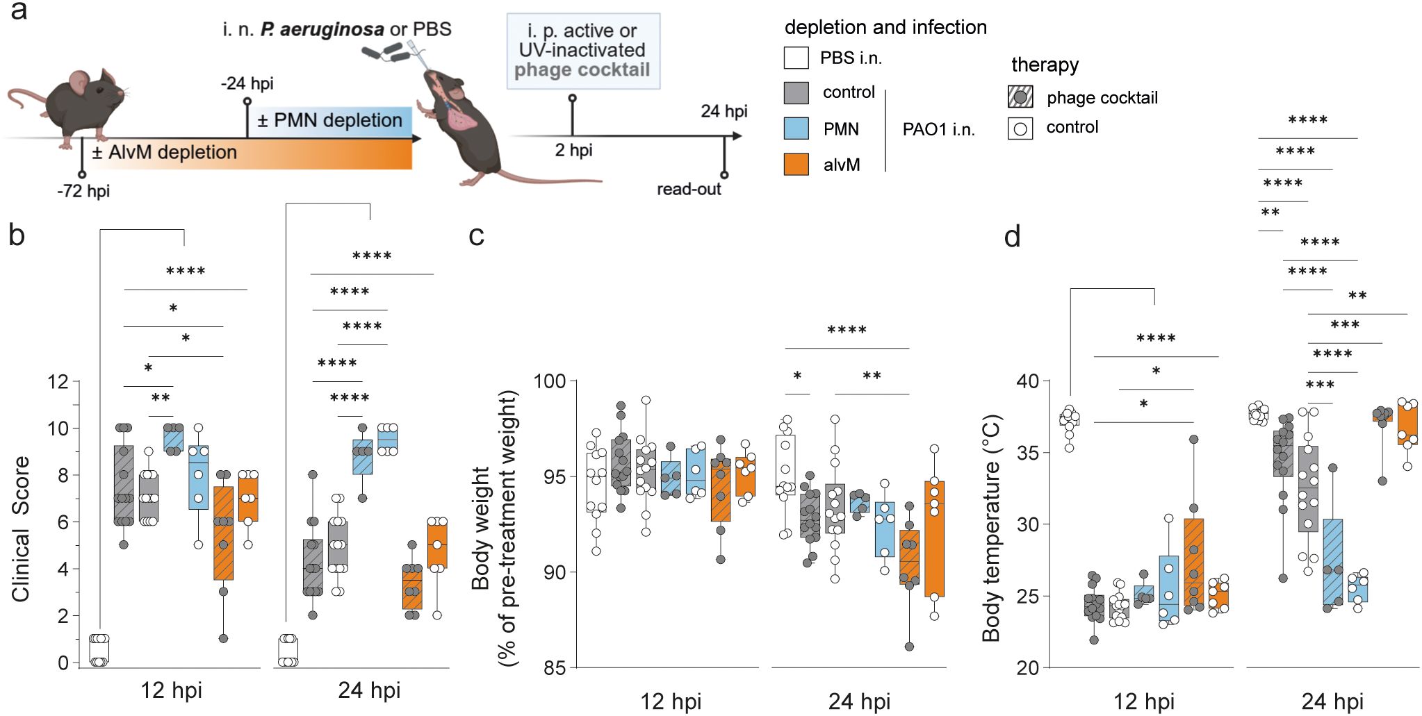 Figure 4. Neutrophils are essential to control P. aeruginosa infection in mice, regardless of phage treatment. (a) Experimental Plan created with BioRender.com. Naive mice (C57BL/6J WT, female, 8–10 weeks; Janvier Labs) were depleted for alveolar macrophages (AlvM) via intratracheal (i. t.) application of Clodronate- or PBS-filled liposomes as control (Liposoma BV, Amsterdam, Netherlands) 72 hours (h) or neutrophils (PMNs) via intraperitoneal (i. p.) application of InVivoPlus anti-mouse Ly6G antibody (clone 1A8; Bio X Cell, Lebanon, USA) or InVivoPlus rat IgG2a, κ isotype control (clone 2A3; Bio X Cell, Lebanon, USA) 24 h before infection. Mice were intranasally (i. n.) infected with PAO1 (5 × 106/20 µL), while sham-infected mice received PBS as control, followed by one intraperitoneal (i. p.) treatment at 2 h post infection (hpi) with a Pseudomonas-specific phage cocktail (approx. 5 × 107 PFU/phage per injection). Analysis time point was 24 hpi. Graphs displaying (b) murine clinical disease score (see Supplementary Table S1), (c) body weight in percent of pre-infection weight and (d) body temperature (°C) at indicated time points. Results are shown as box plots depicting median, quartiles, and range. Two-way ANOVA with Tukey’s multiple comparisons test. Significance not shown between PMN and alvM: *p < 0,05, **p < 0,01, ***p < 0,001, ****p < 0,0001; n = 12 control undepleted, sham-infected, control treated mice (white), n = 14 control undepleted, PAO1-infected mice with phage treatment (grey, dashed lines), n = 14 control undepleted, PAO1-infected, control treated mice (grey), n = 5 mice with PMN cell depletion, PAO1-infection and phage treatment (blue, dashed lines), n = 6 mice with PMN depletion, PAO1-infection and control treatment (blue), n = 8 mice with AlvM depletion, PAO1-infection and phage treatment (orange, dashed lines), n = 7 mice with AlvM cell depletion, PAO1-infection and control treatment (orange). BAL, bronchoalveolar lavage.