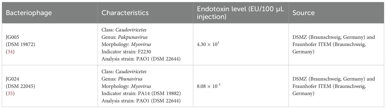 The anti-P. aeruginosa phage cocktail used in vivo consisted of two Pseudomonas phages, DSM 19872 (JG005) (34) and DSM 22045 (JG024) (35), provided by the DSMZ (Braunschweig, Germany) and ITEM Fraunhofer (Braunschweig, Germany) (Table 1). These phages were originally selected for their broad lytic activity against diverse P. aeruginosa strains within the framework of the Phage4Cure consortium. The individual phage suspensions were highly purified by providing institutions through chromatographic procedures, and endotoxins were removed to low, non-immunogenic levels suitable for preclinical application (29). In vitro experiments used a different batch of the same phages mixed with 0.25% human serum albumin (HSA) to increase phage stability. The phage cocktail was prepared by mixing the individual phage suspensions immediately prior to each in vivo (approx. 5 × 107 plaque-forming units (PFU)/phage per injection) or in vitro (MOI = 0.05) experiment in phage buffer (0.1 M NaCI, 8 mM MgSO4, 50 mM Tris-HCI, pH 7.2–7.5) or 1 × DPBS to ensure accurate phage titers. Phage titers of the original phage suspensions were confirmed with the corresponding indicator strains as reported previously (29) (Table 1). The culture conditions of the indicator strains were the same for the analysis strain PAO1, explained above. For each phage in the cocktail, the lytic activity against the bacterial strains used was confirmed in vitro via plaque assay. UV-inactivation of the phage cocktail was performed using a UVC 500 Ultraviolet Crosslinker (Hoefer, Inc., San Francisco, CA, USA) for 2 h at 99,900 µJ/cm2 and confirmed by the absence of plaque-forming units (PFUs) of control treated mice analyzed via plaque assay (Supplementary Figure S2).