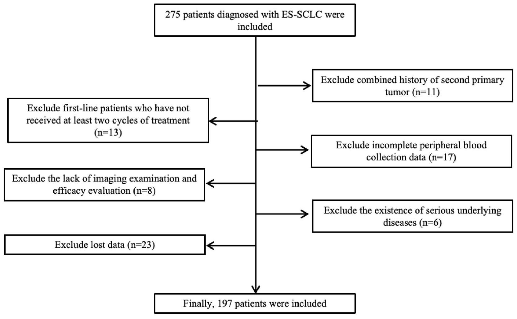 Figure 1. Flow diagram of patient enrollment. A total of 275 patients diagnosed with ES-SCLC were screened; 78 were excluded for predefined reasons, and 197 patients were finally included in the analysis.