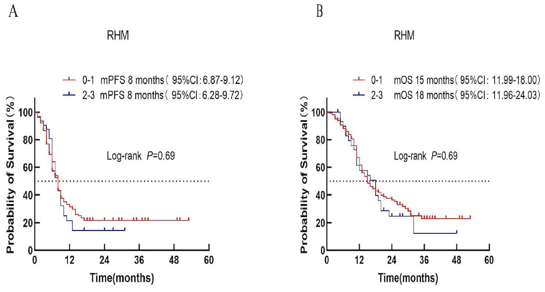 Patients were stratified into low-risk (score 0–1) and high-risk (score 2–3) categories according to the RMH score.Median PFS was 8 months in both groups (P = 0.69; Figure 2A). Median OS was 15 months for the low-risk group and 18 months for the high-risk group (P = 0.69; Figure 2B).