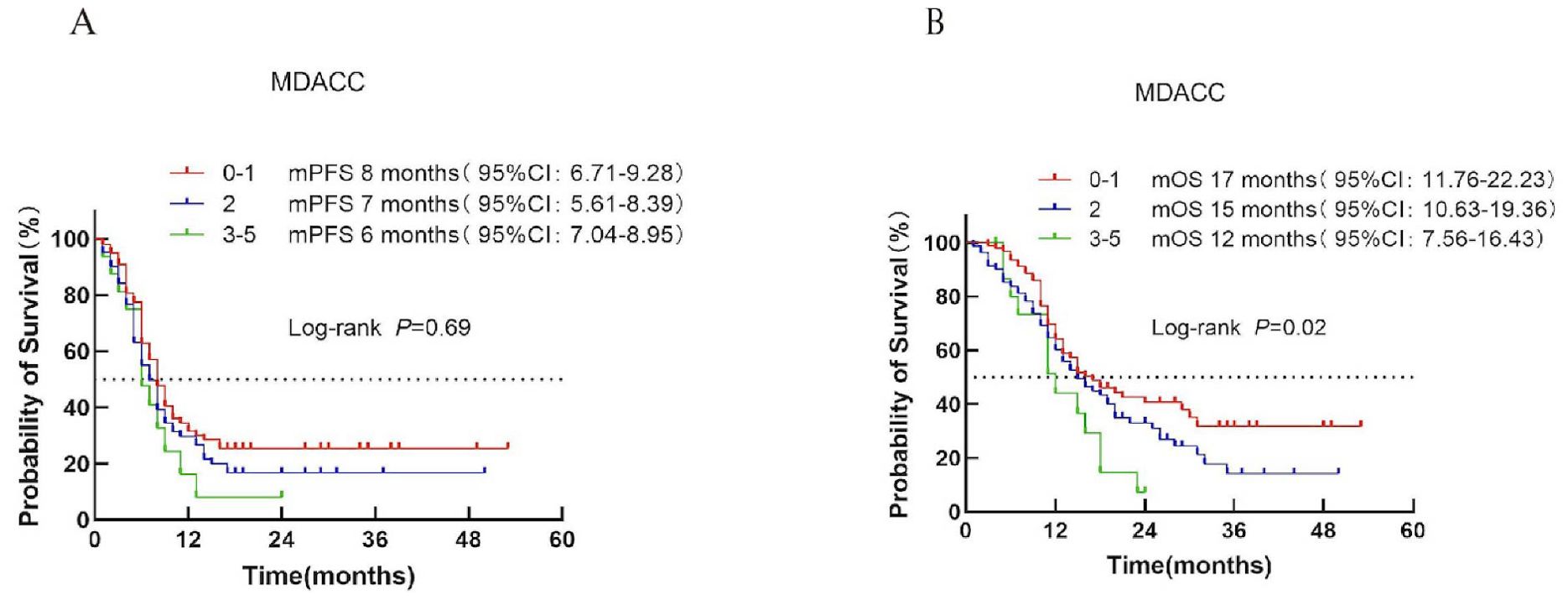 Based on the MDACC score, patients were divided into low-risk (score 0–1), intermediate-risk (score 2), and high-risk (score 3) categories. Median PFS was 8, 7, and 6 months for the respective groups (P = 0.69; Figure 3A). In contrast, median OS differed significantly among the three groups (17, 15, and 12 months; P = 0.02; Figure 3B).