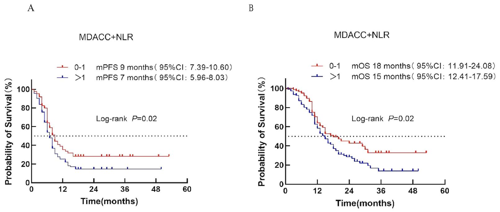 Patients were stratified into low-risk (score 0–1) and high-risk (score >1) categories according to the MDACC + NLR score. Median PFS was 9 months in the low-risk group and 7 months in the high-risk group (P = 0.02; Figure 4A). Median OS was 18 vs. 15 months, respectively (P = 0.02; Figure 4B), demonstrating a clear prognostic distinction between the two groups.
