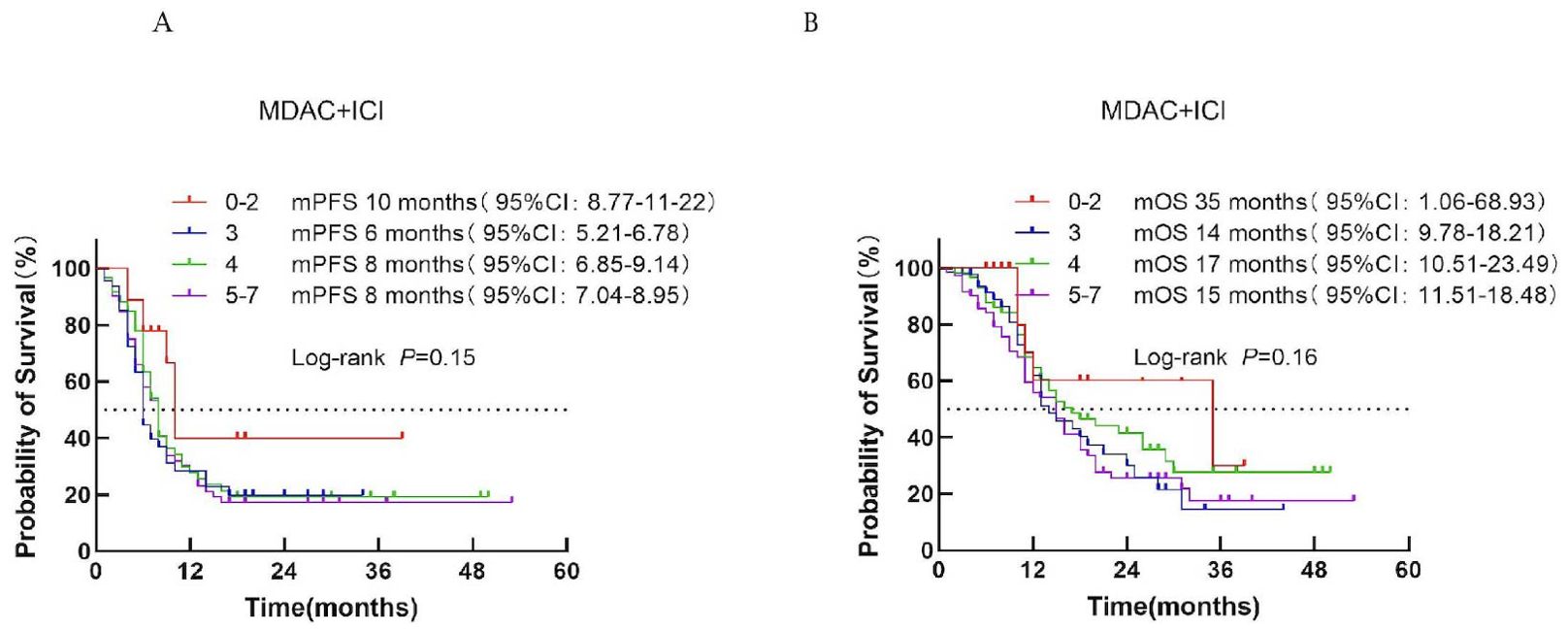 According to the MDA-ICI score, patients were classified into three risk groups: low risk (score 0–2), intermediate risk (score 3–4), and high risk (score 5–7). Median PFS was 10, 7, and 8 months for the low-, intermediate-, and high-risk groups, respectively (P = 0.15; Figure 5A). Median OS was 35, 15, and 16 months, respectively (P = 0.16; Figure 5B). No significant survival difference was observed across risk categories, indicating limited prognostic value for this model.