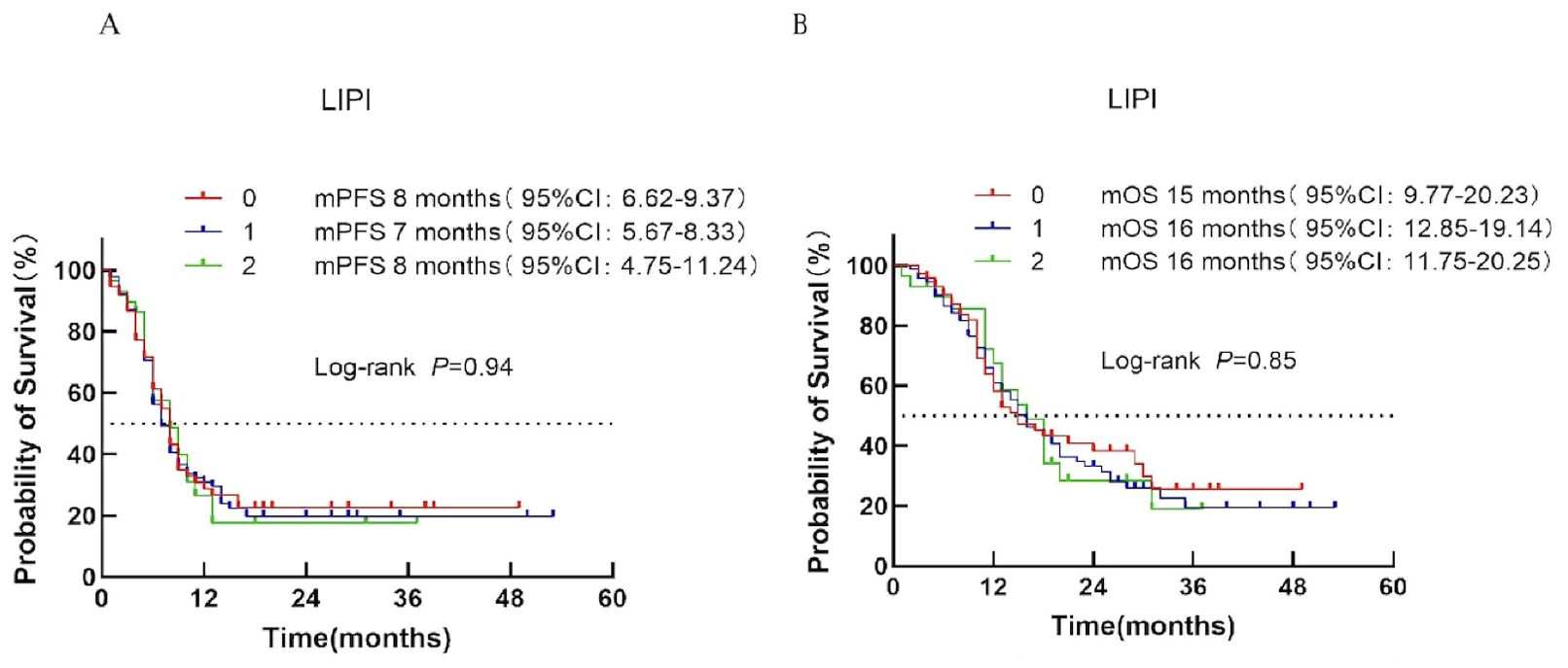 Based on the Lung Immune Prognostic Index (LIPI), patients were classified into low-risk (score 0), intermediate-risk (score 1), and high-risk (score 2) groups corresponding to LIPI scores of 0, 1, and 2, respectively. Median PFS was 8, 7, and 8 months for the low-, intermediate-, and high-risk groups, respectively (P = 0.94; Figure 6A). Median OS was 15, 16, and 16 months, respectively (P = 0.85; Figure 6B).