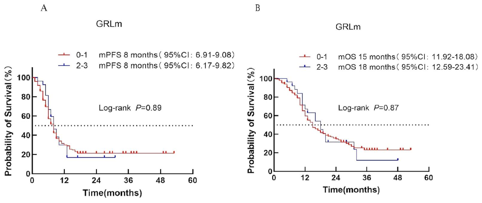 Patients were divided into low-risk (score 0–1) and high-risk (score 2–3) categories according to the GRIm score. Median PFS was 8 months in both groups (P = 0.89; Figure 7A). Median OS was 15 months for the low-risk group and 18 months for the high-risk group (P = 0.87; Figure 7B), indicating no significant prognostic discrimination.
