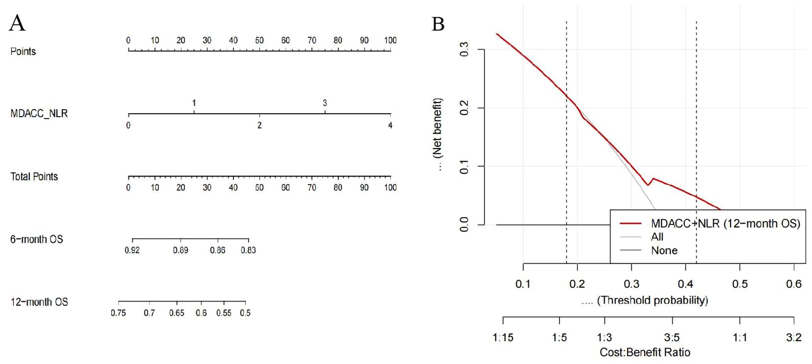 A Cox proportional hazards model using the MDACC+NLR composite score as the predictor was applied to evaluate its prognostic value for overall survival (OS). Model performance was assessed by Harrell’s concordance index (C-index, 1,000 bootstrap resamples) and bias-corrected calibration curves at 6 and 12 months. A nomogram was constructed to visualize individualized survival probabilities, and decision curve analysis (DCA) was used to estimate the clinical net benefit across threshold probabilities. All analyses were performed in R (version 4.x) using the rms, Hmisc, rmda, and timeROC packages, with a two-sided α = 0.05.