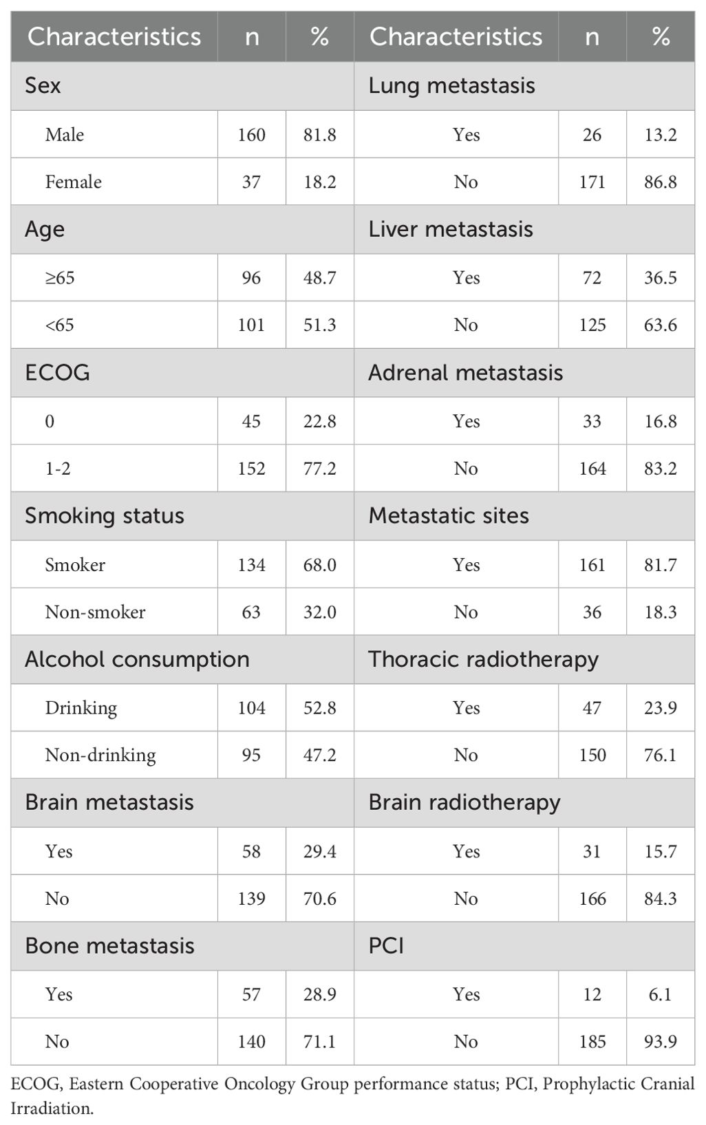 Among the 197 patients, 160 (81.8%) were male and 37 (18.2%) were female. The median age was 65 years; 101 patients (51.3%) were <65 years, and 96 (48.7%) were ≥65 years. Forty-five patients (22.8%) had an ECOG performance status <1, while 152 (77.2%) had ECOG ≥1.